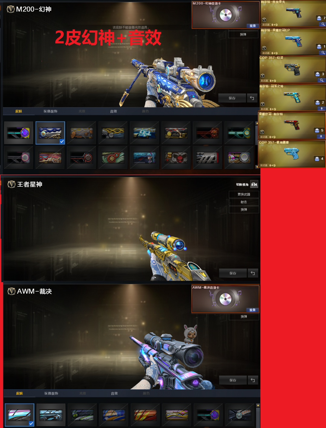 装备描述:排位:可以、、、、、、、、、、、、、爆破四防:幻神2皮+音效(KZ冠军、巅峰荣耀皮肤)、王者幻神、王者星神、、、、、COP幻灵、柯尔特竞技荣光、冠军之特、EP荣耀柯尔特、世冠柯尔特、COP极地霜雄、传说圣灵、白虎、QBZ金色蔷薇、炽芒蝶刃、、、、幻神音效、裁决音效、毁灭音效、白虎音效、黑骑士音效、、、4套幻灵、1套竞技荣光、1套云龙、1套雷霆王者、4套雷暴王者、、、爆破四防(妮妮、关小雨、机械姬、谜、职业经理)