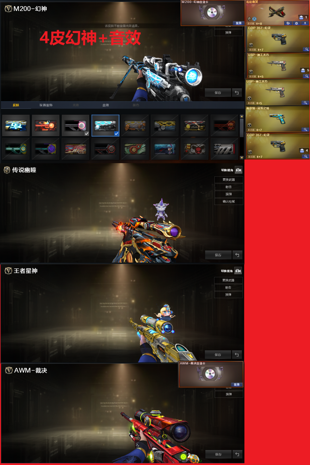 排位:可以--------------生化四防(可以变更背包、查看生化僵尸血量):无需换弹6烈、盘龙、炼狱、死亡之眼、MAC涂鸦、黄金猫猫手套、生化雷、、、、、、、、爆破四防:幻神3皮肤+音效(宠儿、冠军之幻、纸灯笼皮肤)、王者星神、传说幽瞳、传说幽冥、2个COP幻灵、2个USP神工天巧、冠军之特、白虎、QBZ天罚、玄武、白虎之魄、王者芳薇、、、、幻神音效、裁决音效、蔷薇音效、黑龙音效、白虎音效、朱雀音效、天神音效、屠龙音效、、、1套雷霆、1套电竞装甲、7套幻灵、7套神工天巧、、、、生化四防(影豹、王者华冠服)爆破四防(传说艾莉莎、王者潘多拉、鹰)