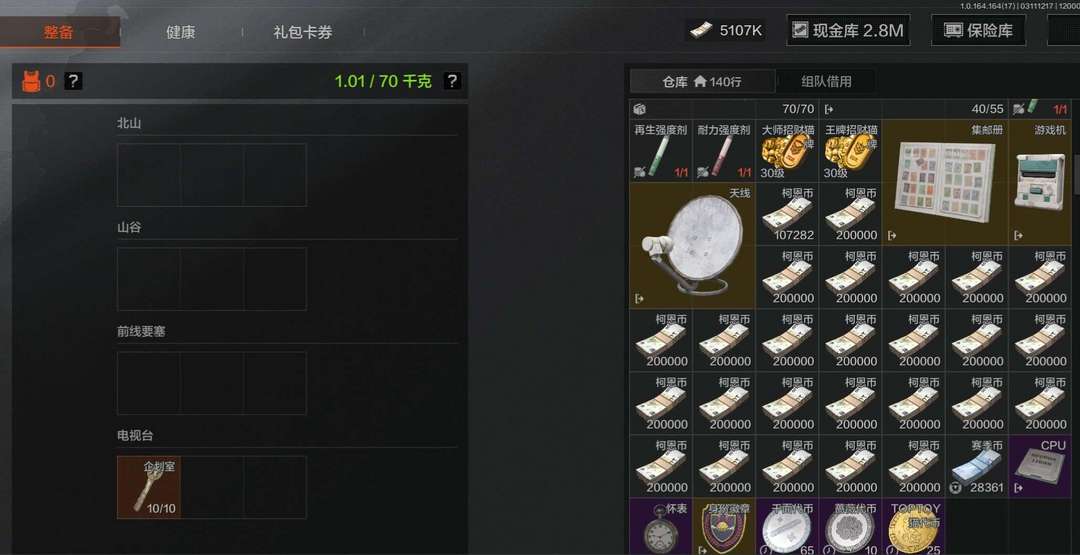 仓库有500多万币,要塞钥匙,北山钥匙,农场钥匙全没,1金皮,欢迎各位老板来玩