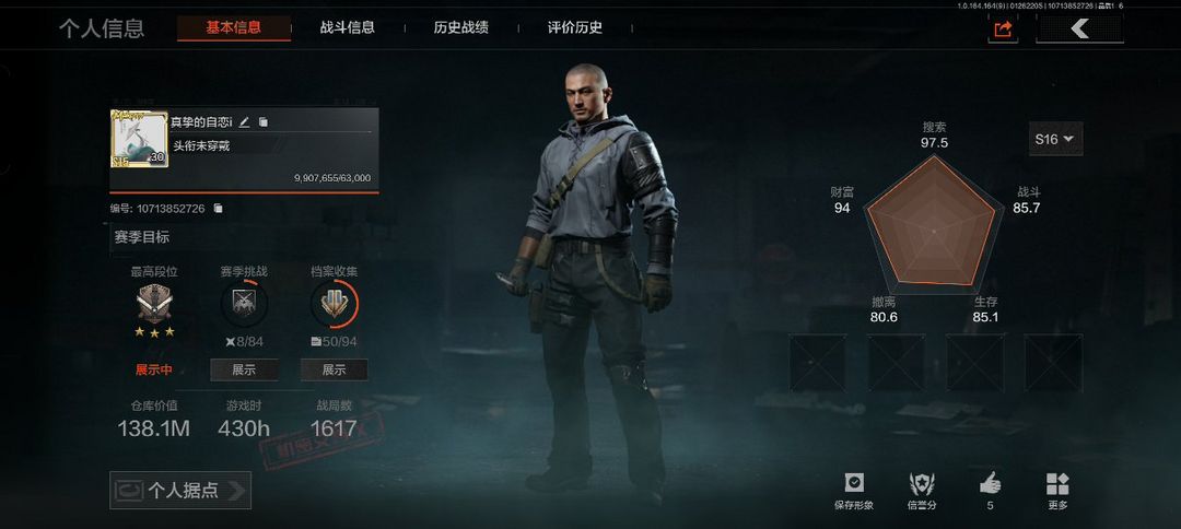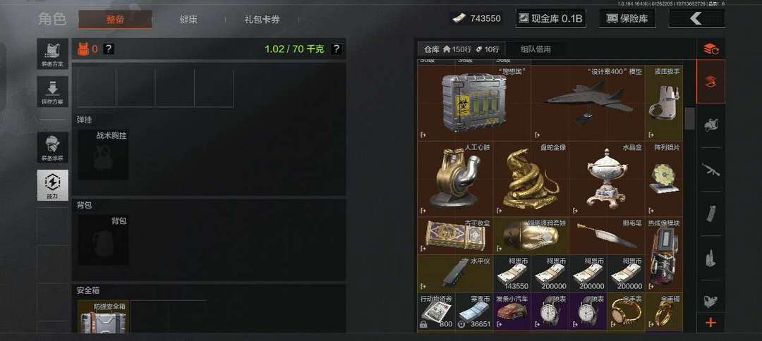 科恩币充足,枪装备的皮肤都有,详情看截图,有6格安全箱,科恩币1.3个亿
