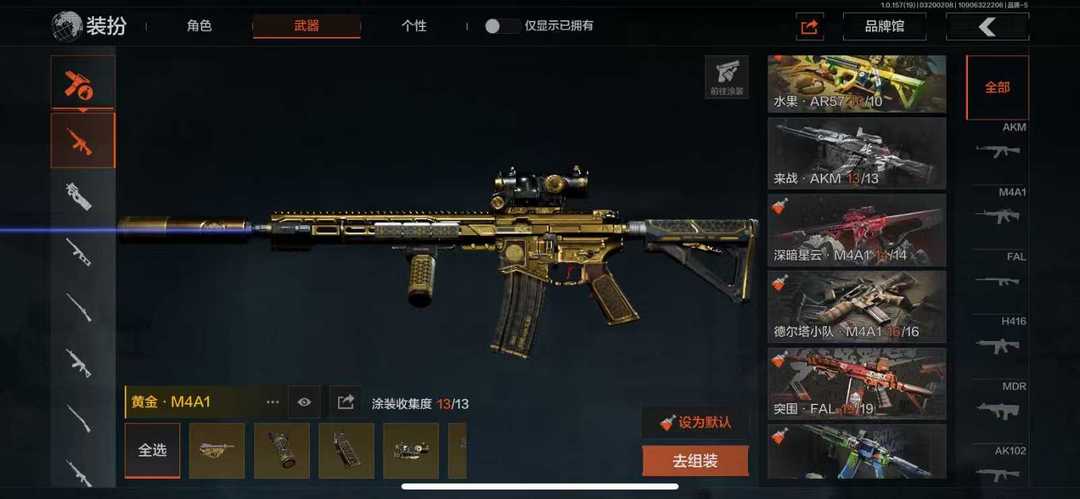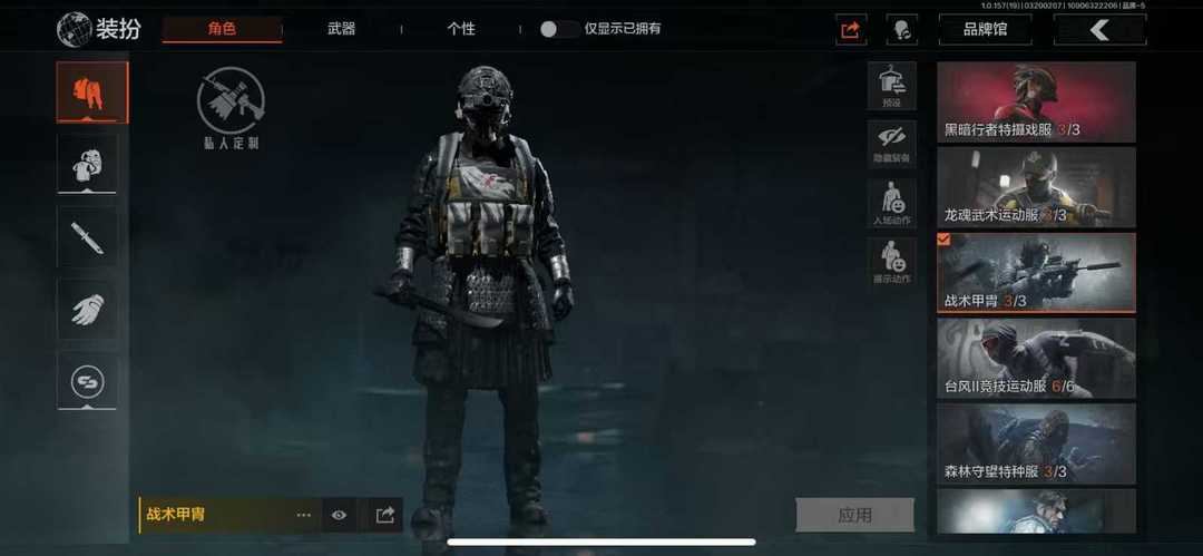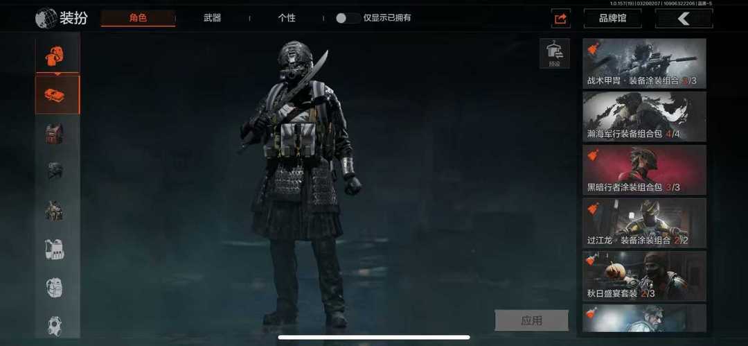 宇bleak:涂鸦利刃 胜利军刀 明刀·绣春 龙魂·双节棍 工兵铲 来战·开山刀 禁忌力量手套 战术甲胄·防护手套 黑暗行者特摄戏服 龙魂武术运动服 战术甲胄 黄金·M4A1 骑士之剑·M4A1 诸星之子·FAL 战术大师·FAL 堕落者·H416 水果·AR57 来战·AKM 深暗星云·M4A1 德尔塔小队·M4A1 突围·FAL 涂鸦·AK102 来战·AK74N 山地伪装·AK74N 极恶·AUG 深蓝·AEK 胜利锋刃·AEK 龙威·T951 林地数码·T03 深蓝·MP5 龙威·MP5 玄戈梨花·MPX 涂鸦·MPX 灰鼠幻歌·P90 玄戈梨花·VSS 全地形数码·M110 台风II竞技运动服