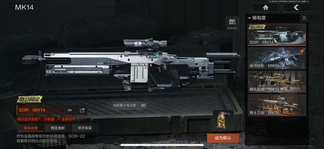 宇7300暗区:2橙衣12金衣15金刀4手套3橙枪20多金枪 瑞兔折刀 冥王 巴斯特 冰河碎影MK14