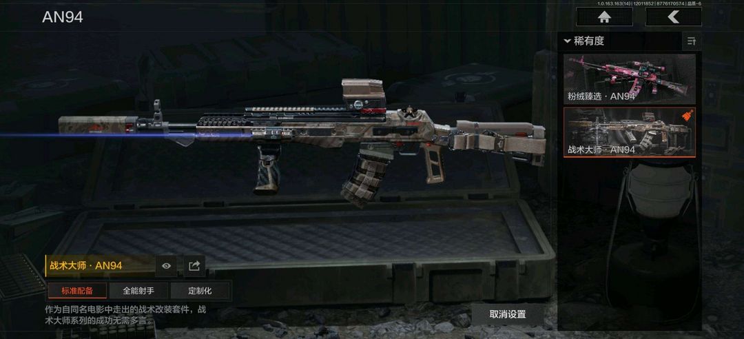 告丧夜曲AUG,战术大师AEK,旗帜AEK,战术大师AN94,旧王圣谕QBZ191,乌金黑曜QBZ192,突围FAL,幻域莎绫M4A1,战术大师AK74N,逆火玄石AEK,炎夏浪花AR57,逆火玄石ACE31,粉绒臻选AN94,正在骇入Groza,骤羽尖啸AK12;高塔之内P90,战术大师Suomi;