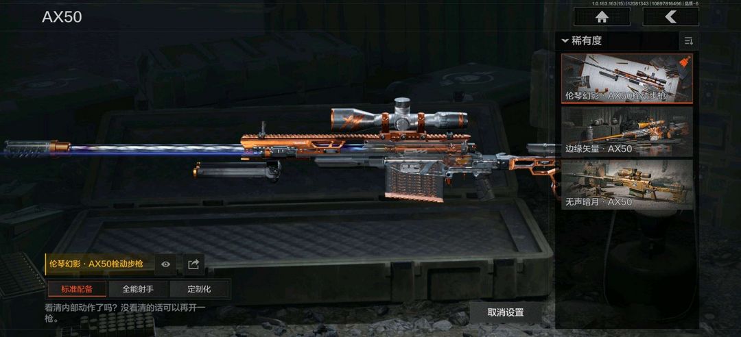 伦琴幻影AX50栓动步枪,边缘矢量AX50,无声暗月AX50,粉绒臻选AR30,超越自我AR30,战术大师SJ16,武侍SJ16,护命金翎M24;典礼武备M2