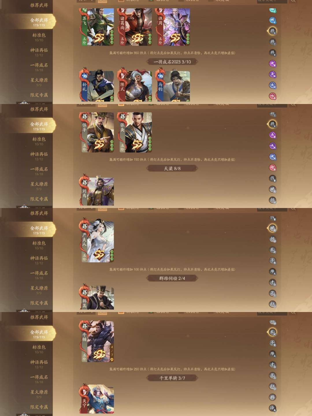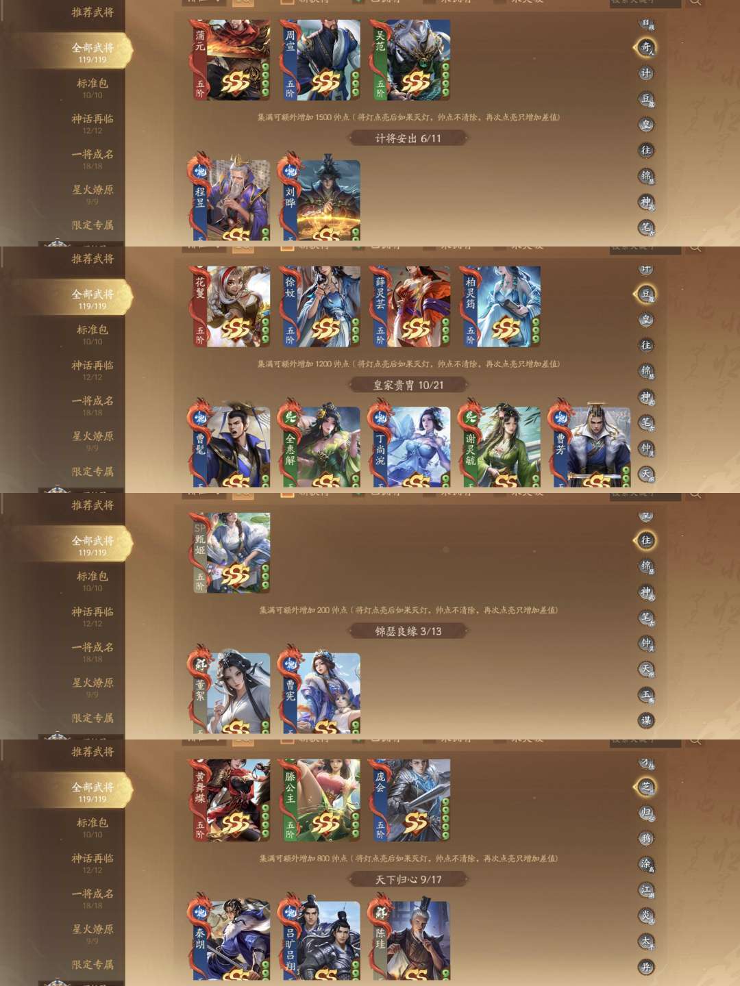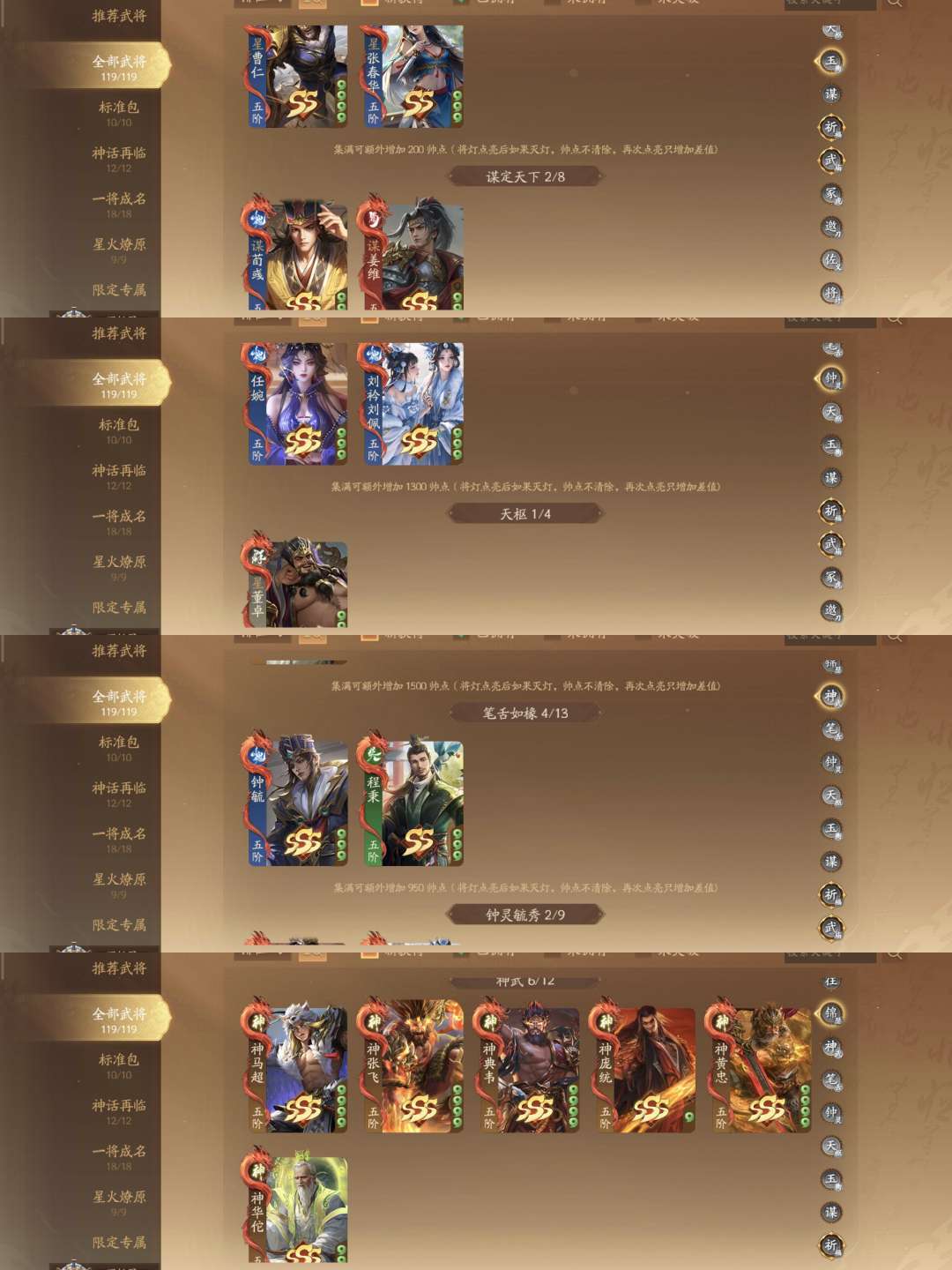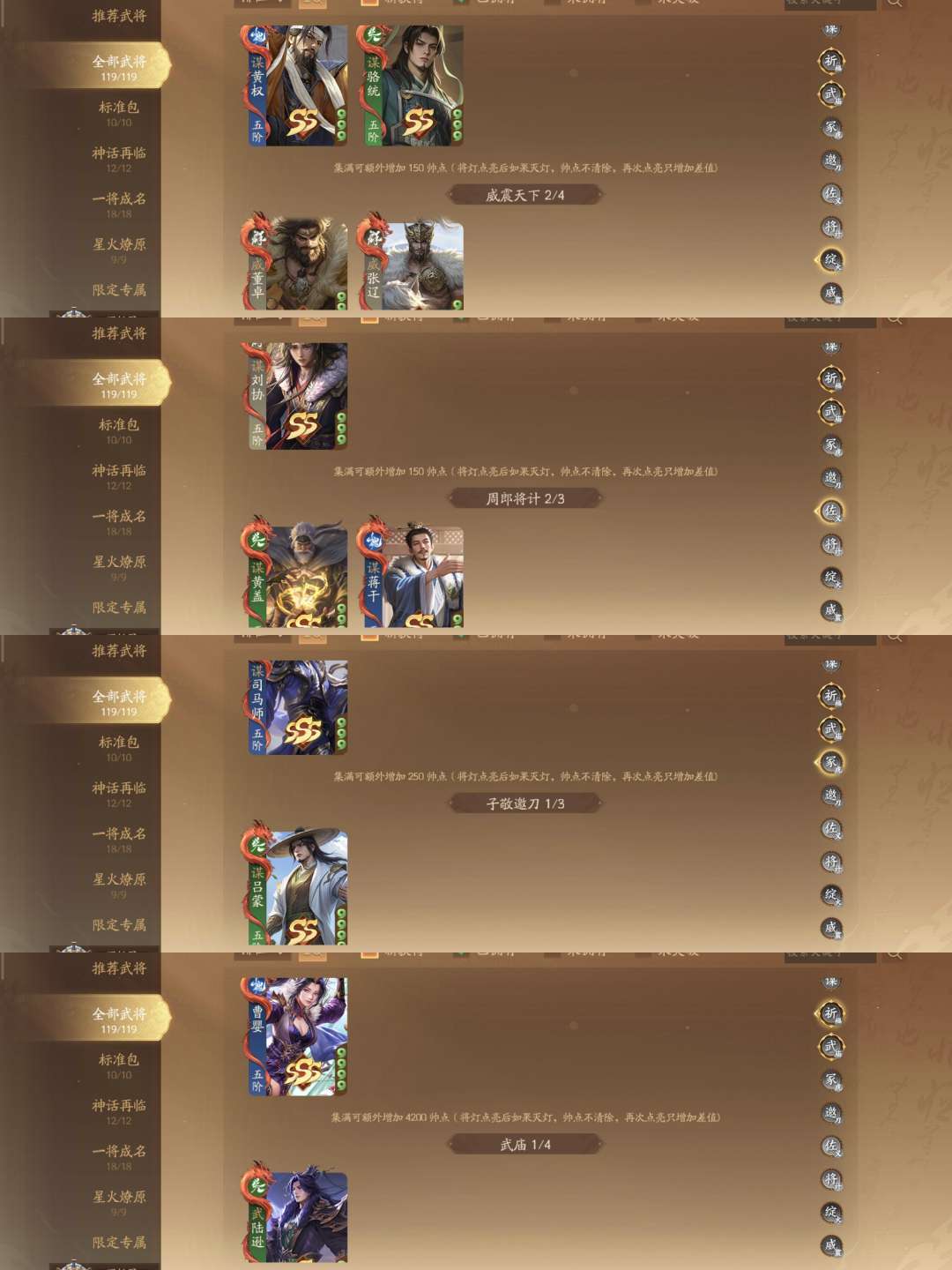 武陆逊谋荀彧谋姜维威张辽威董神张飞神黄忠神庞统神马超神华佗 祈福:曹芳任婉柏灵筠刘袊刘佩 充值:关宁管宁吕据谋骆统胡遵 纳贤:谋蒋干谋吕蒙周宣乐蔡文姬乐菜爹徐文薛灵芸乐祢衡黄舞蝶诸葛均钟毓谋司马师sp甄姬秦朗谋黄权袁胤张曼成乐小乔刘晔丁尚涴曹宪星曹仁星张春华星董卓谋刘协谢灵毓 砸蛋:董旭藤公主全会解庞会 将符:曹婴程昱花鬘童渊张嫙黄承彦牛辅诸葛尚吴范孙綝刘巴蒲元陈珪SP孟获 其他:神典韦程秉张奂伍孚陈式马钧孙礼