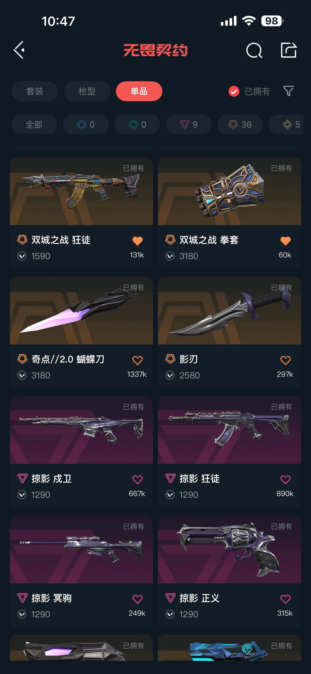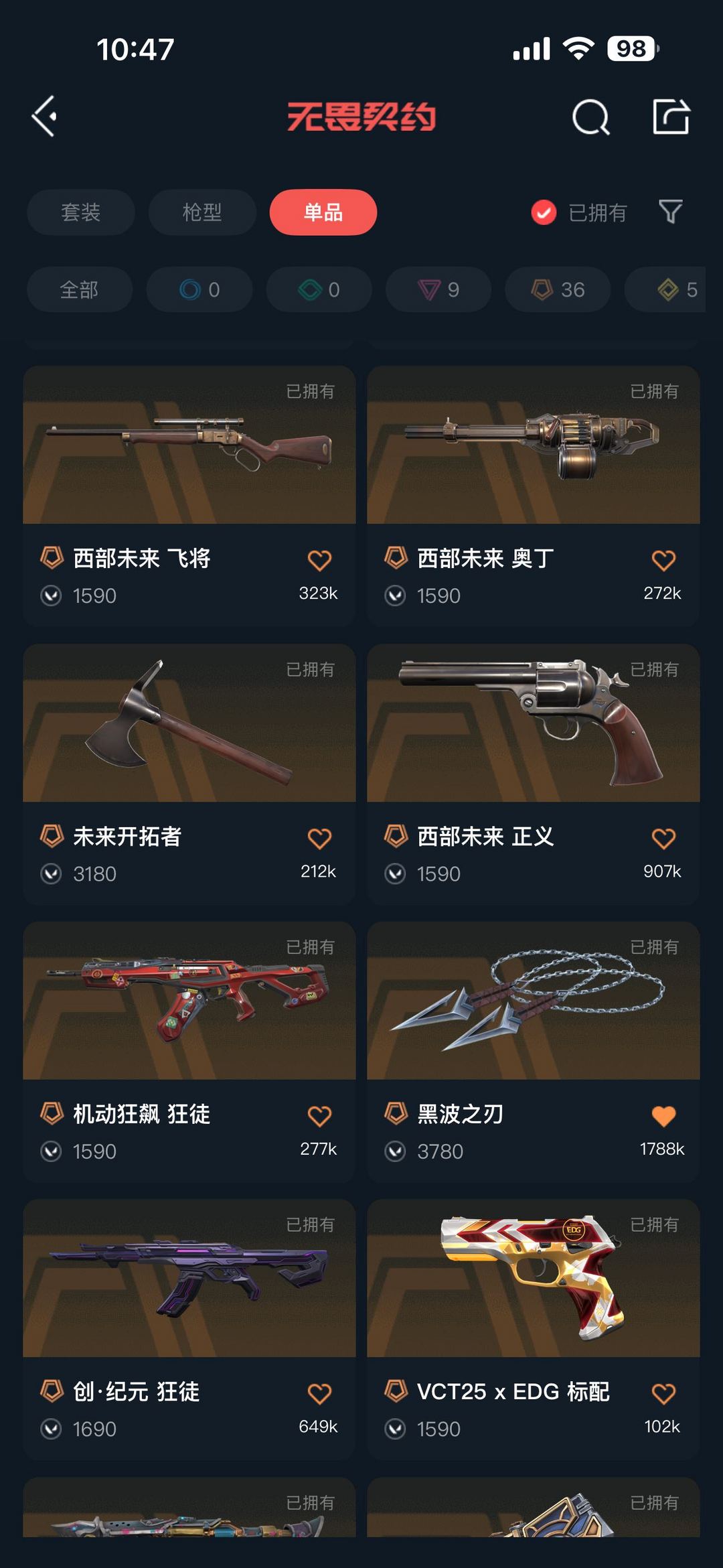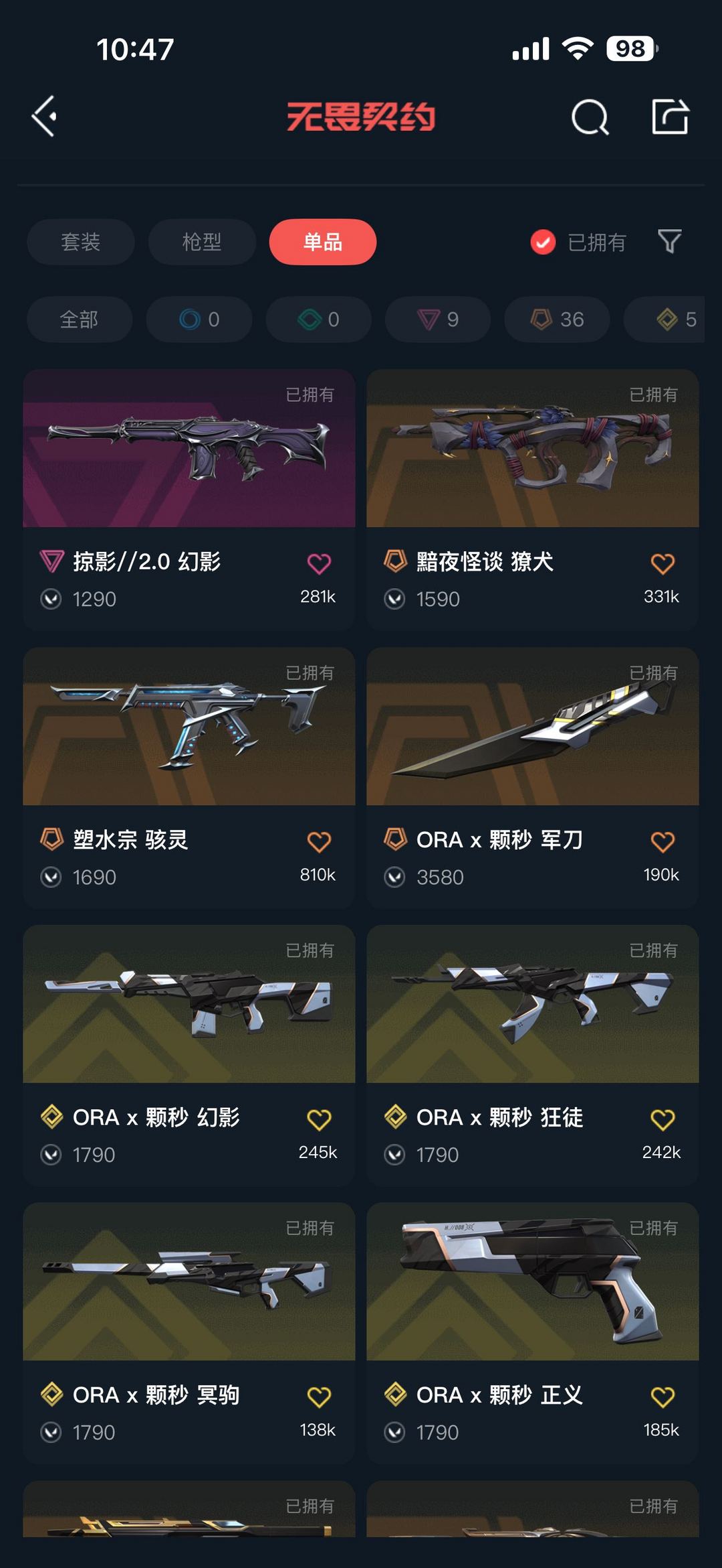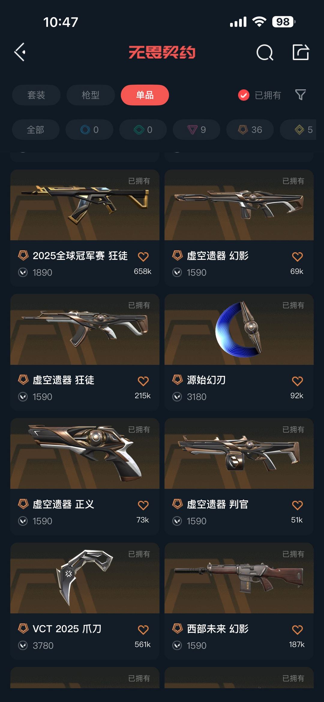 随身武器:ORA x 颗秒 正义虚空遗器 正义西部未来 正义VCT25 x EDG 标配掠影 正义奇点 正义VCT x LEV 标配RGX 11z Pro//3.0 标配塑水宗 正义盖亚的复仇 鬼魅紫阙金琅 标配