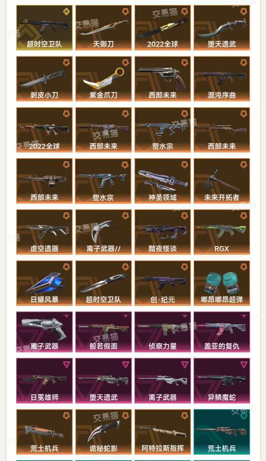 时间到了建议续租,为了防止顶号,请您及时续租获得更好的游戏体验禁止利用账号进行开挂、使用辅助违规软件诈骗等违规操作。开挂需负法律责任。为防止炸鱼被封,排位最好不要拿mvp。禁止挂机消极比赛,挂机扣钱。盖亚的复仇套装(盖亚的复仇狂徒) 塑水宗套装(塑水宗狂徒) 日冕雄师(日冕雄师狂徒) 堕天遗武套装(堕天遗武冥驹,堕天遗武仪式匕首) 异形猎人(剥皮小刀) 天界神兵//2.0(天御刀) 英雄之选 礼包(堕天遗武冥驹) 离子武器(离子武器正义,离子武器冥驹) 侦察力量(侦察力量幻影) 紫阙金琅//2.0(紫金爪刀) 混沌序曲 礼包(混沌序曲狂徒)西部未来全套(西部未来幻影 狂徒 正义 飞将 边陲)异鳞魔蛇(异鳞魔蛇幻影)RGX(RGX 狂徒)超时空卫队(超时空狂徒,超时空军刺) 2022全球冠军赛套装(2022全球冠军套幻影蝴蝶刀)