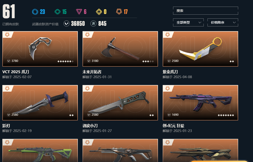 VCT爪刀,紫金爪,西部套,显卡ak,侦查m4,5刀4ak3m4,精品皮肤多,能用到的枪基本上都有