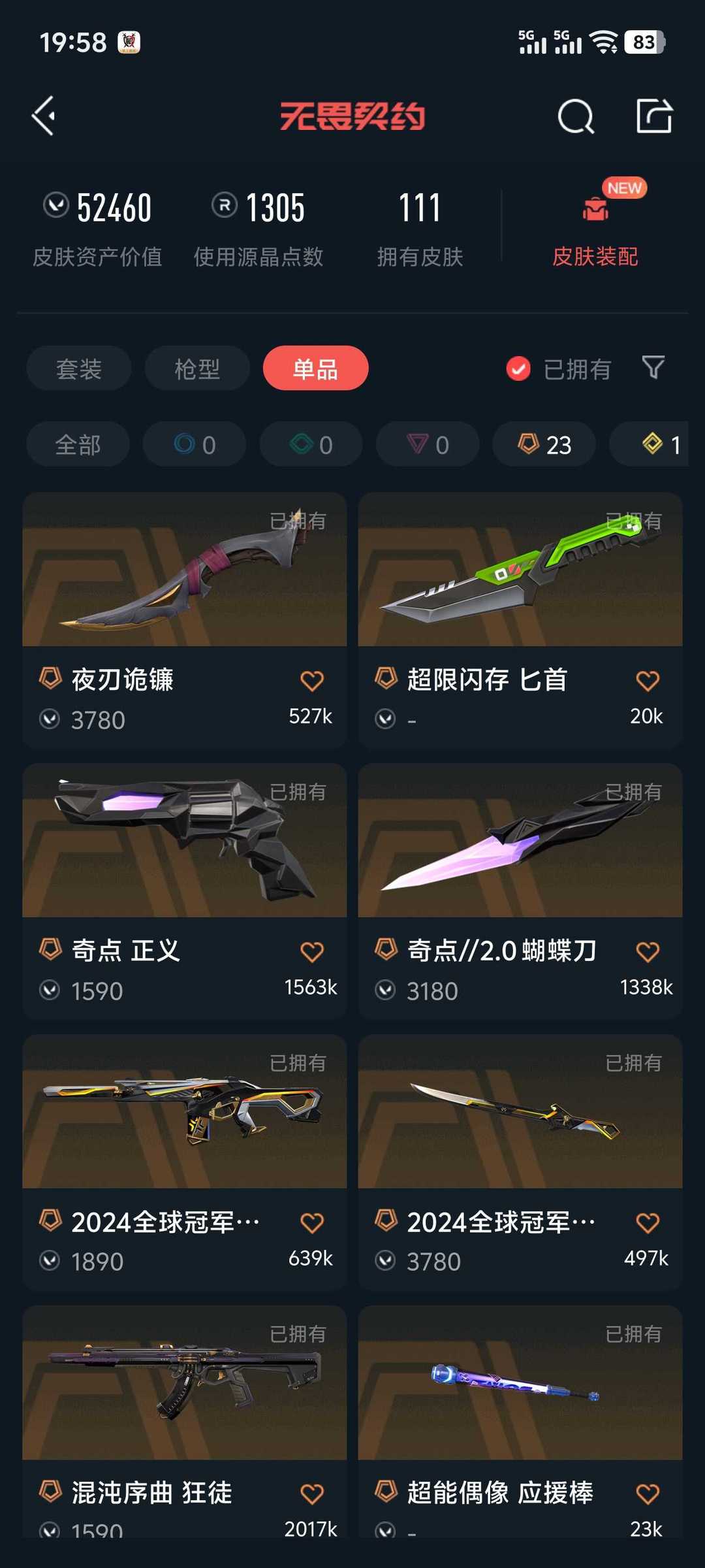 号上皮肤多多,23冠军,24冠军套,盖亚,混沌,归零套,奇点正义,刀皮多,爪刀,镰刀,蝴蝶刀等等 禁止利用账号进行开挂、使用辅助违规软件诈骗等违规操作。