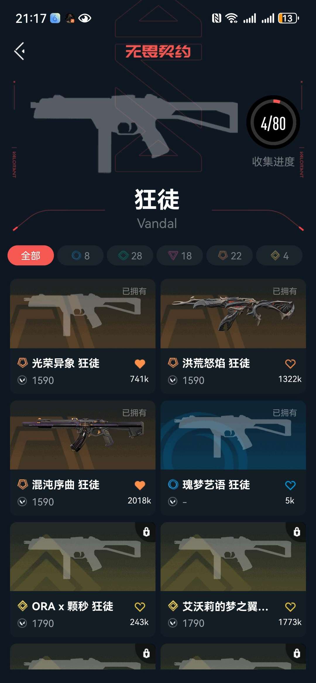 全英雄,狂徒三把皮肤,流脓,混沌,光荣,幻影一把皮肤,神中神罚。离子正义,天界鬼魅,紫金爪刀。其他枪械没皮肤