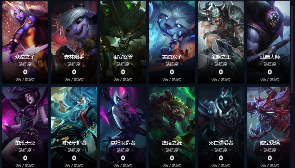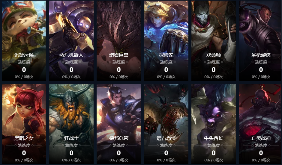 发条魔灵;爆破鬼才;皮城女警;炽炎雏龙;正义巨像;探险家;虚空之女;赏金猎人;诺克萨斯统领;奥术先驱;圣枪游侠;无极剑圣;符文法师;武器大师;虚空行者;风暴之怒;蒸汽机器人;暗夜猎手;酒桶;离群之刺;皎月女神;青钢影;祖安花火;暴走萝莉;暗裔剑魔;解脱者;残月之肃;流光镜影;双界灵兔;黑暗之女;德邦总管;诡术妖姬;亡灵战神;战争女神;众星之子;迅捷斥候;麦林炮手;祖安怒兽;雪原双子;寒冰射手;炼金术士;虚空恐惧;殇之木乃伊;祖安狂人;琴瑟仙女;海洋之灾;英勇投弹手;熔岩巨兽;复仇焰魂;盲僧;沙漠死神;圣锤之毅;德玛西亚之力;曙光女神;深渊巨口;暮光之眼;光辉女郎;远古巫灵;法外狂徒;不灭狂雷;惩戒之箭;北地之怒;诺克萨斯之手;未来守护者;暮光星灵;星籁歌姬;疾风剑豪;岩雀;戏命师;影流之主;时间刺客;皮城执法官;唤潮鲛姬;沙漠皇帝;魔法猫咪;复仇之矛;逆羽;万花通灵;铁血狼母;不破之誓;不落魔锋;异画师