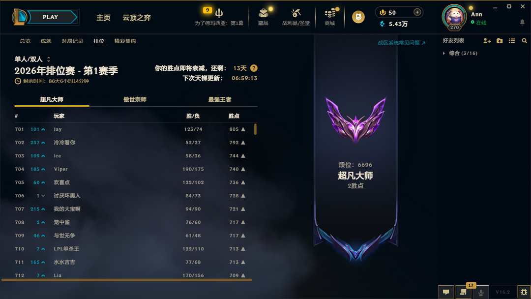 段位:271级 超凡大师