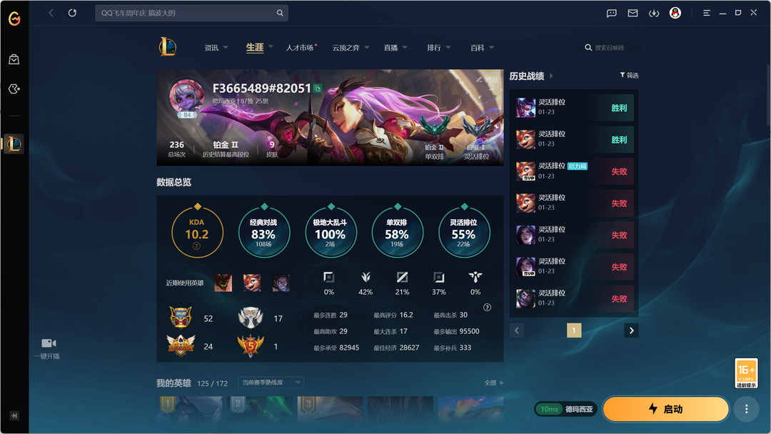本账号位于《英雄联盟》联盟五区德玛西亚服务器,单双铂金2·灵活白银1。隐藏分处于同段位较低水平,匹配对局中多为新手或休闲玩家。 账号拥有常用英雄、基础符文页、常规召唤师技能及部分皮肤,无封禁或异常记录。描述内容真实,仅反映账号当前状态。