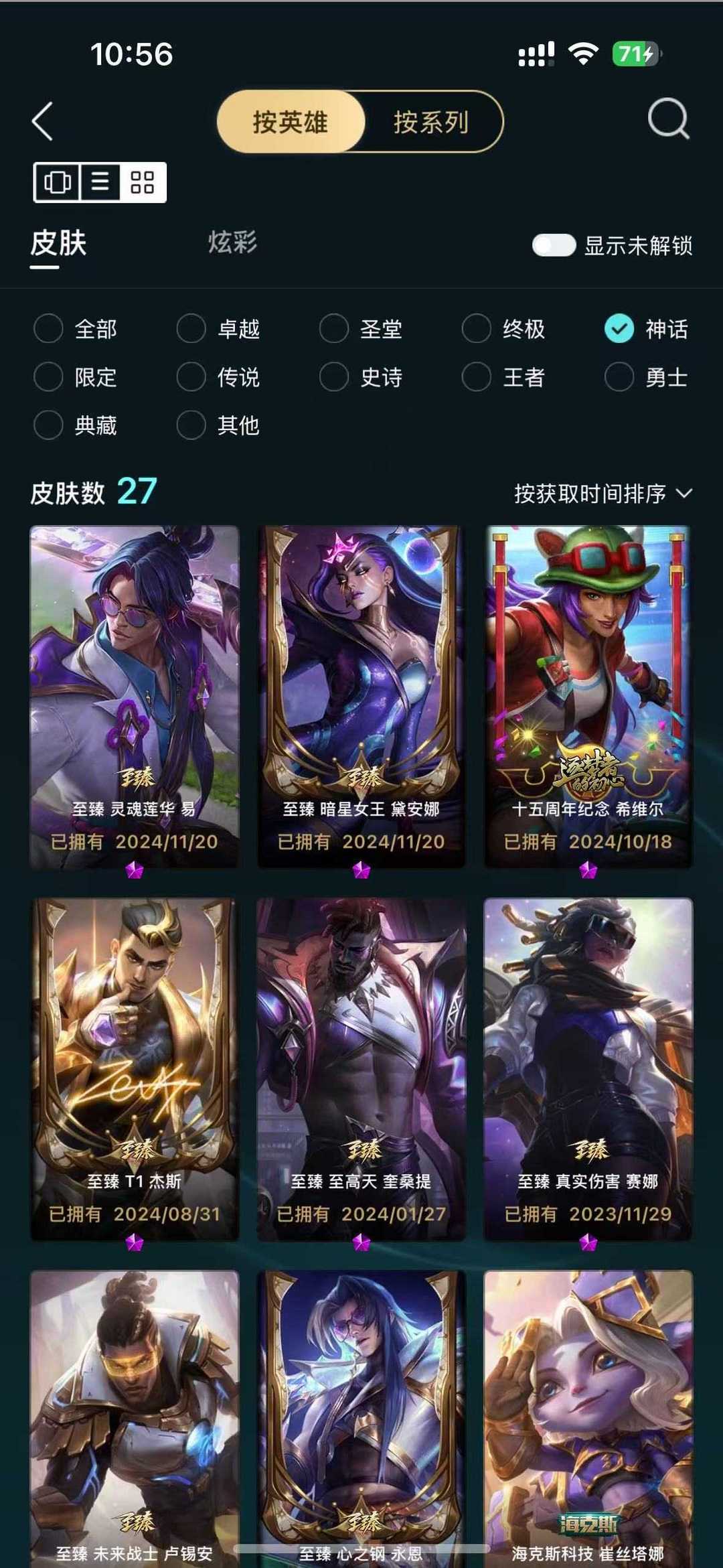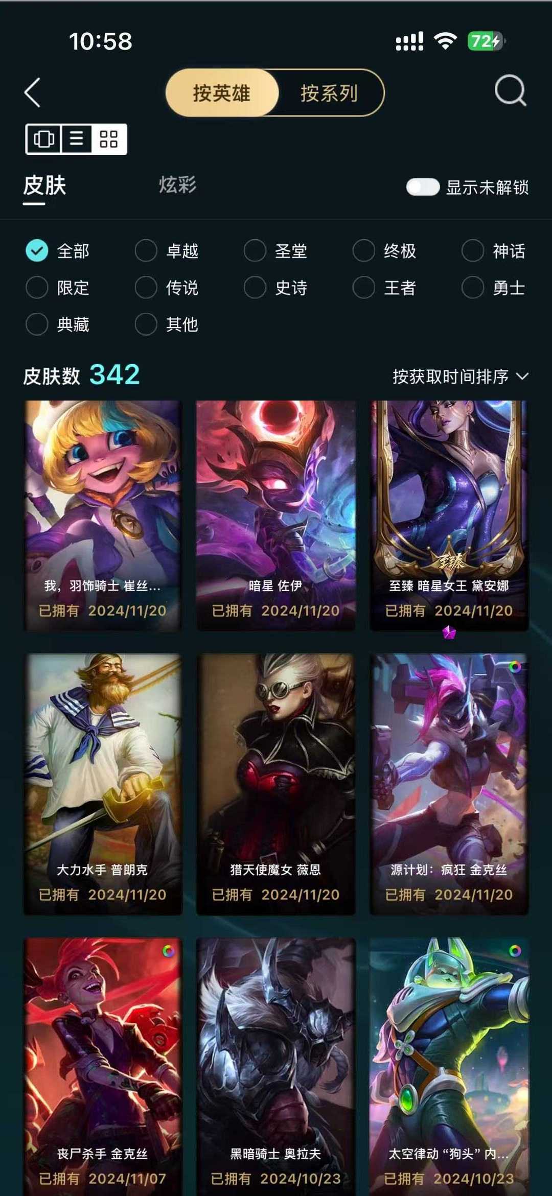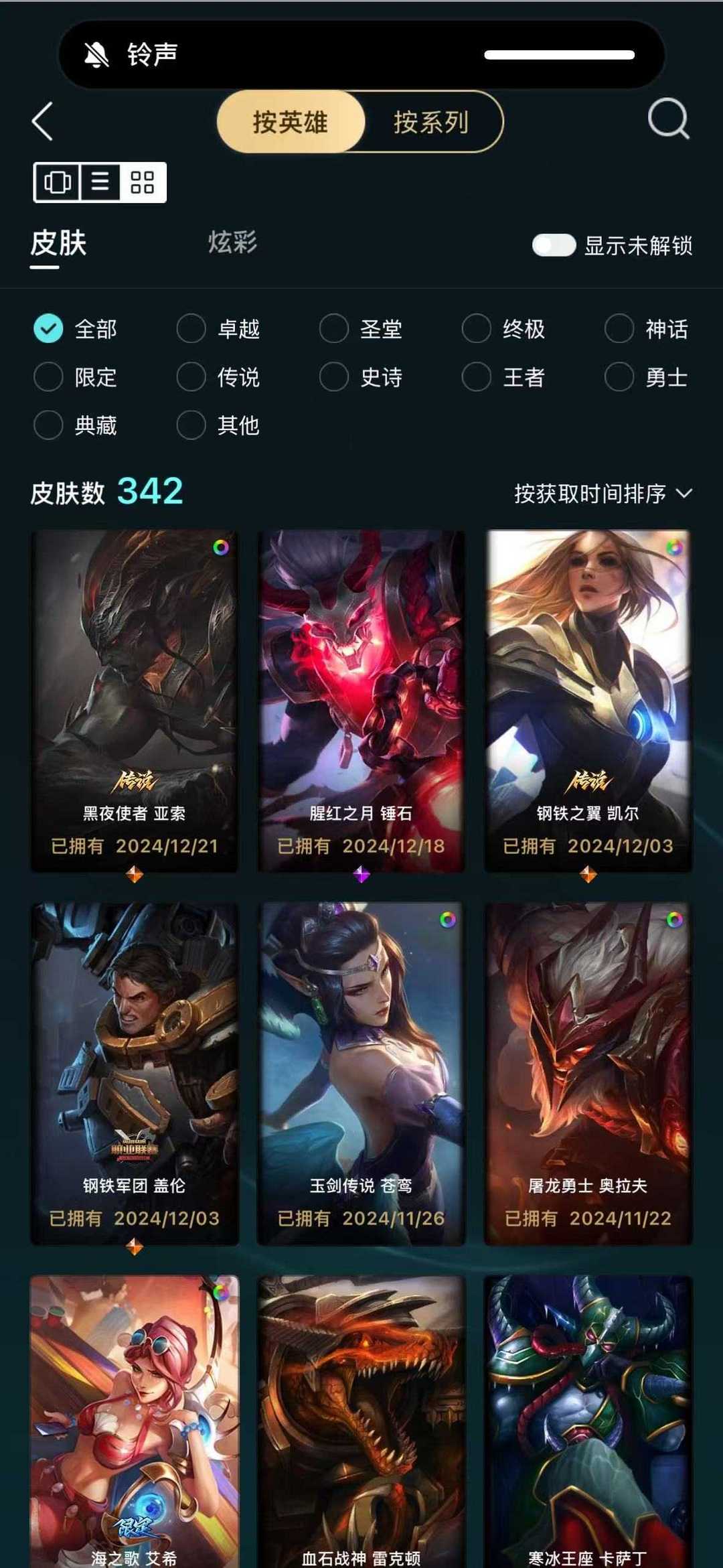 有峡谷之巅资格可打排位都是热门限定绝版皮肤总共342个皮肤炫彩皮肤258真彩皮肤10个