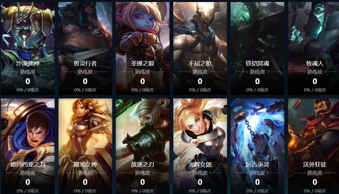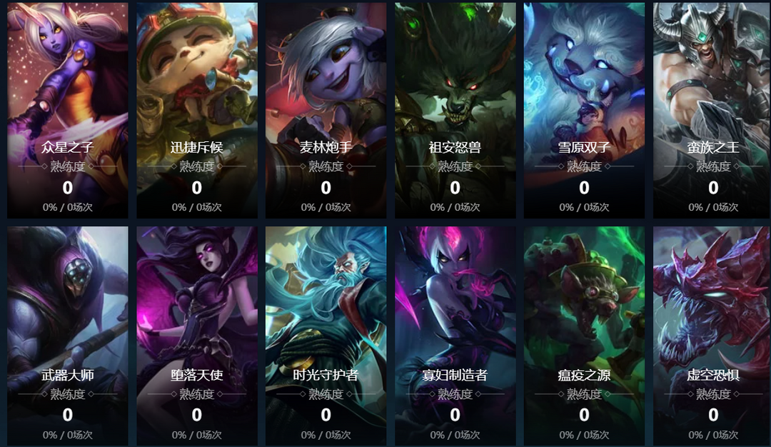 战争女神;潮汐海灵;深渊巨口;奥术先驱;符文法师;沙漠死神;寒冰射手;迅捷斥候;蛮族之王;堕落天使;虚空先知;铸星龙王;逆羽;远古恐惧;无极剑圣;牛头酋长;武器大师;虚空恐惧;皮城女警;曙光女神;皮城执法官;祖安怒兽;虚空行者;探险家;德玛西亚之力;北地之怒;殇之木乃伊;复仇焰魂;光辉女郎;不灭狂雷;皎月女神;虚空之眼;圣枪游侠;德邦总管;正义天使;亡灵战神;赏金猎人;瘟疫之源;英勇投弹手;邪恶小法师;熔岩巨兽;德玛西亚皇子;狂野女猎手;不屈之枪;仙灵女巫;星籁歌姬;影流之主;魔法猫咪;沙漠玫瑰;黑暗之女;众星之子;麦林炮手;雪原双子;披甲龙龟;祖安狂人;琴瑟仙女;风暴之怒;蒸汽机器人;盲僧;圣锤之毅;铁铠冥魂;远古巫灵;诺克萨斯之手;虚空之女;疾风剑豪;戏命师;海兽祭司;复仇之矛