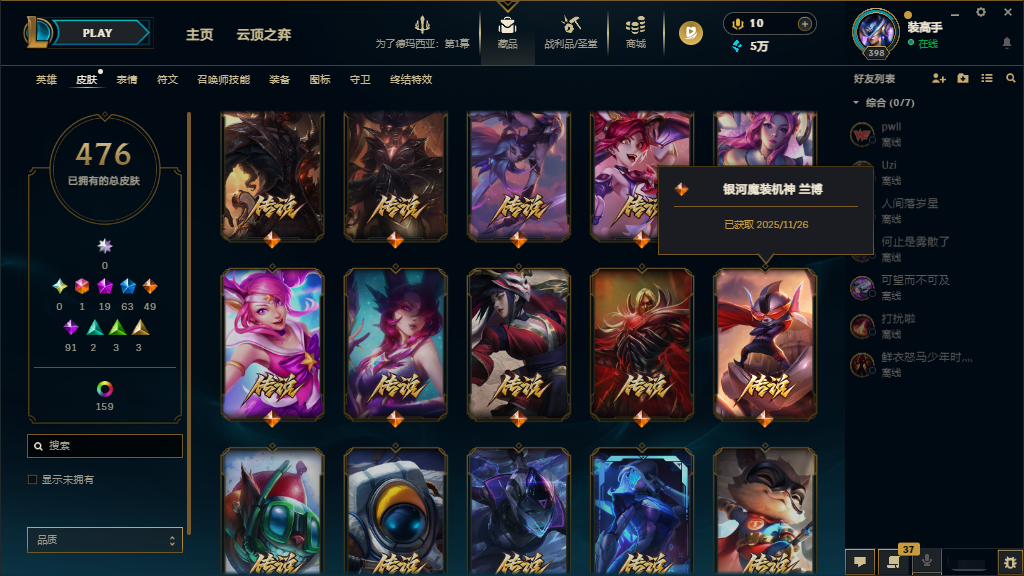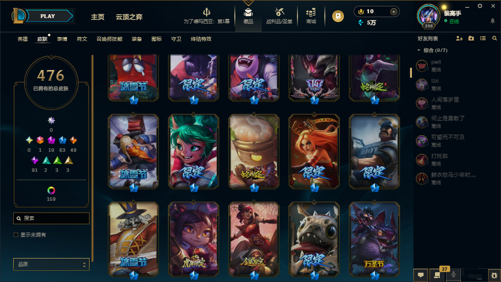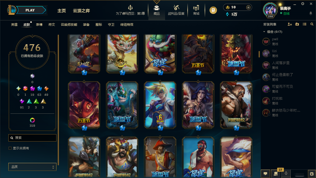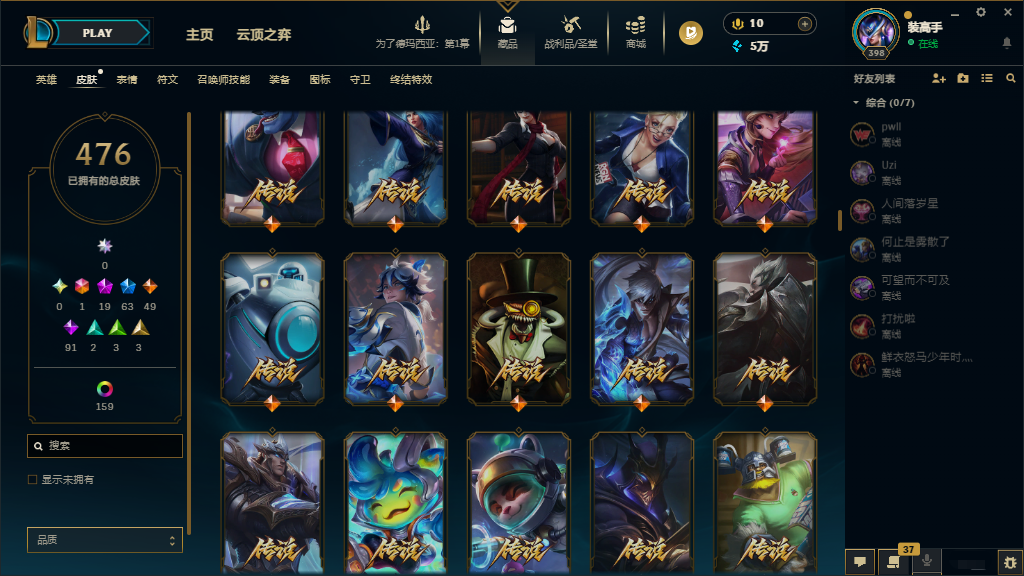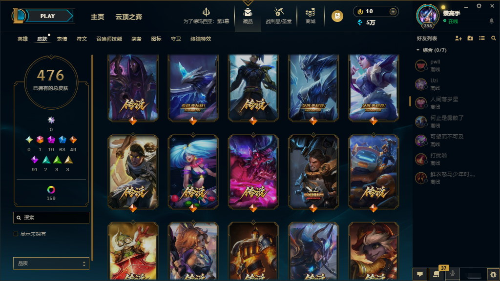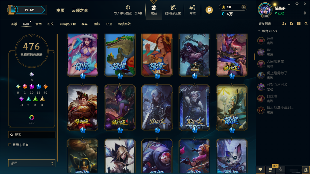 联盟五区‖可排位♥真实皮635♥原皮476♥炫彩159♥北极星卡蜜尔♥花木兰♥KDA阿狸真实伤害亚索
