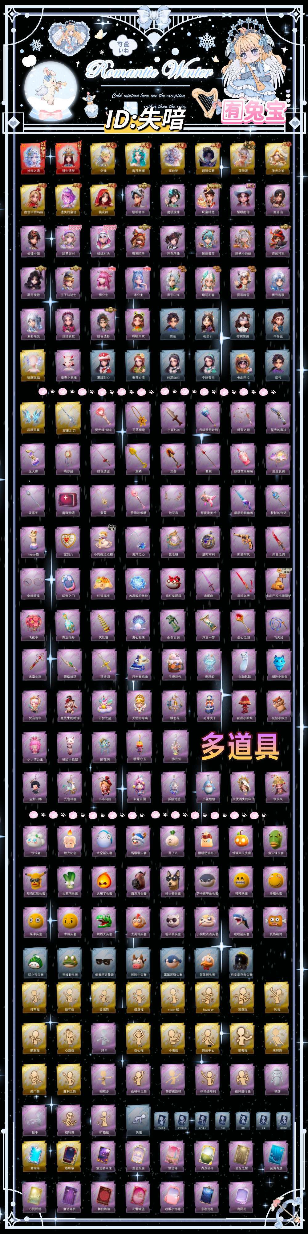 装备描述:逍遥/莉莉全皮。卡头,白泽头耀世脸紫身 卡皮巴拉汉堡皮肤 双字ID 小黄-遗失的童话,爱丽丝-血色中的玛丽,薇薇安-圣光之谕,巫铃儿-镜花辞 小黄-霓裳踏雪,爱丽丝-冰公主,爱丽丝-丝缕哀歌,爱丽丝-瑞羽衔春,薇薇安-黑月挽歌,零-赤炼将军,巫铃儿-素影瑶光,阿念-王子与骑士;饰品:头饰-炙热烧烤,头饰-小狗蛇点点头套,头饰-驼半仙头套,头饰-太美鸡头套,头饰-鱼头怪头套,头饰-烈焰红唇头套,头饰-嘻嘻头套,头饰-滑稽头套,头饰-呆滞头套,头饰-萨卡班甲鱼头套,背饰-蝶恋花,背饰-毛球夹子,背饰-天使的呼唤,背饰-云梦之星,背饰-在逃小新娘,背饰-兔先生的时钟,挂饰-钗头凤,挂饰-天使消失的年代,挂饰-小鲨包包,挂饰-未竟乐园,挂饰-小小玛丽;道具:铲子-圣心之泪,铲子-龙鳞,铲子-焰骨,桃木剑-永眠曲,桃木剑-最后的独角兽,刺刀-小鲨匕首,刺刀-赤色之刃,长鞭-小狗蛇点点鞭,传送按钮-昆仑镜,传送按钮-幻宠之门, 动作:鹏友摇,来财舞,伤心摇,动作-心跳摇,DL摇,敲门舞,星奇摇,动作-胜利之舞,律动迪斯科,抬手,痞帅进行曲 全员工