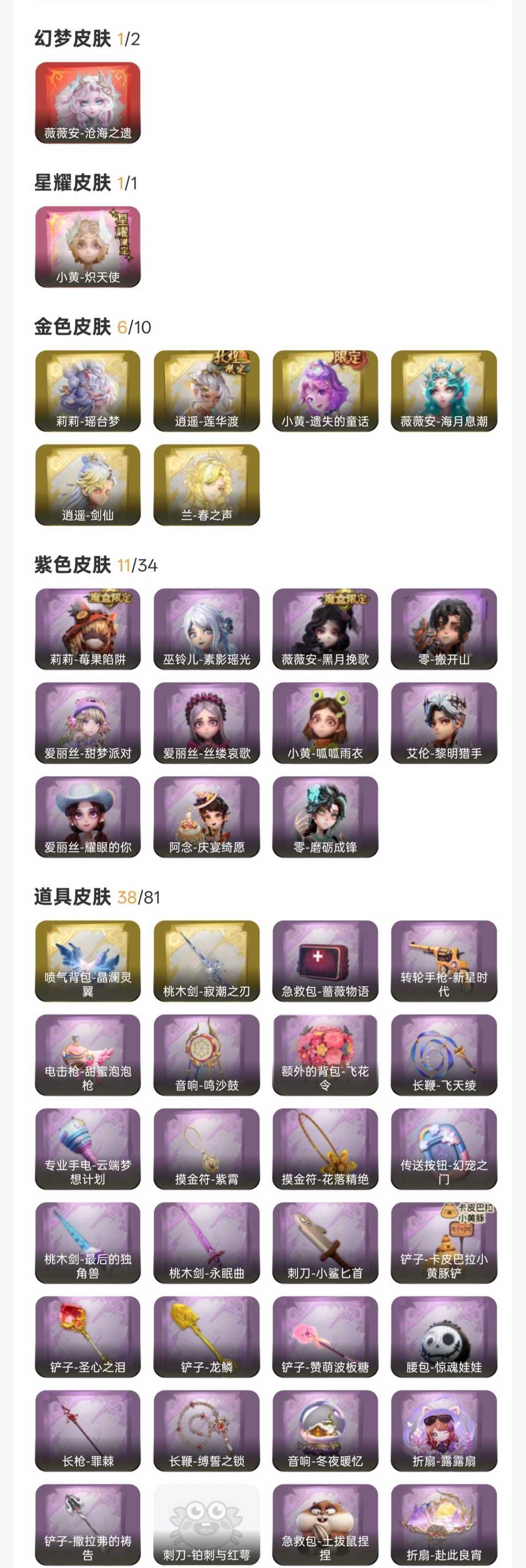 装备描述:支持自己卖宝物。小黄-炽天使,薇薇安-沧海之遗,莉莉-瑶台梦,兰-春之声,小黄-遗失的童话,薇薇安-海月息潮,逍遥-剑仙,逍遥-莲华渡,薇薇安-黑月挽歌,爱丽丝-耀眼的你,阿念-庆宴绮愿,艾伦-黎明猎手,小黄-呱呱雨衣,巫铃儿-素影瑶光,零-搬开山,莉莉-莓果陷阱,爱丽丝-甜梦派对,零-磨砺成锋,爱丽丝-丝缕哀歌;道具:喷气背包-晶澜灵翼,桃木剑-寂潮之刃,长枪-波塞冬,夜视仪-敛花容,闪光弹-金戈玄铜,刺刀-小鲨匕首,专业手电-云端梦想计划,传送按钮-幻宠之门,桃木剑-永眠曲,铲子-撒拉弗的祷告,折扇-赴此良宵,电击枪-权杖的许诺,腰包-惊魂娃娃,专业手电-花束般的告白,除颤仪-冰晶般的代价,铲子-赞萌波板糖,刺刀-铂刺与红萼,音响-鸣沙鼓,急救包-蔷薇物语,折扇-露露扇,黄牛能量饮料-无人岸,长枪-罪棘,铲子-龙鳞,葫芦-海心凝珠,长鞭-缚誓之锁,摸金符-花落精绝,腰包-红运福虎,音响-月光奏鸣曲,转轮手枪-新星时代,电击枪-甜蜜泡泡枪,桃木剑-最后的独角兽,铲子-卡皮巴拉小黄豚铲,音响-冬夜暖忆,铲子-圣心之泪,长鞭-飞天绫,摸金符-海洋之心,额外的背包-