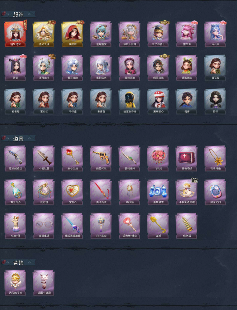装备描述:巫铃儿-镜生遗梦 【金色皮肤】薇薇安-圣光之谕、巫铃儿-镜花辞 【紫色皮肤】阿念-迷途僵宝、莉莉-除妖小师妹、阿念-王子与骑士、莉莉-情公主、爱丽丝-冰公主、小黄-罗丽、逍遥-泽引山海、零-青云逸歌、巫铃儿-素影瑶光、爱丽丝-丝缕哀歌、逍遥-绣春逍影、小黄-呱呱雨衣 【道具皮肤】短管猎枪-星光的裁决、刺刀-小鲨匕首、铲子-圣心之泪、转轮手枪-新星时代、刺刀-碧络琅环、额外的背包-飞花令、急救包-蔷薇物语、摸金符-花落精绝、黄牛能量饮料-青玉抱丹、传送按钮-昆仑镜、腰包-宝剑八、桃木剑-凤鸣九天、音响-鸣沙鼓、喷气背包-乘风溯雪、长鞭-小狗蛇点点鞭、传送按钮-幻宠之门、音响-happy猫、夜视仪-金丝眼镜、桃木剑-最后的独角兽、腰包-月下莲台、铲子-龙鳞、葫芦-伏妖塔 【头饰】小财神豚豚头套、鱼头怪头套、烈焰红唇头套、大葱明头套、火爆了头套、面具马头套、哈士奇头套、萨卡班甲鱼头套、嘻嘻头套、滑稽头套、呆滞头套、卑微头套、炙热烧烤、像素朋克墨镜、后室幸存者头套 【背饰】天使的呼唤、绒团小狐狸 【挂饰】天使消失的年代、钗头凤 【动作】luvaboy、鸳鸯戏、DL摇、鹏友摇、心跳摇、伤心摇、小