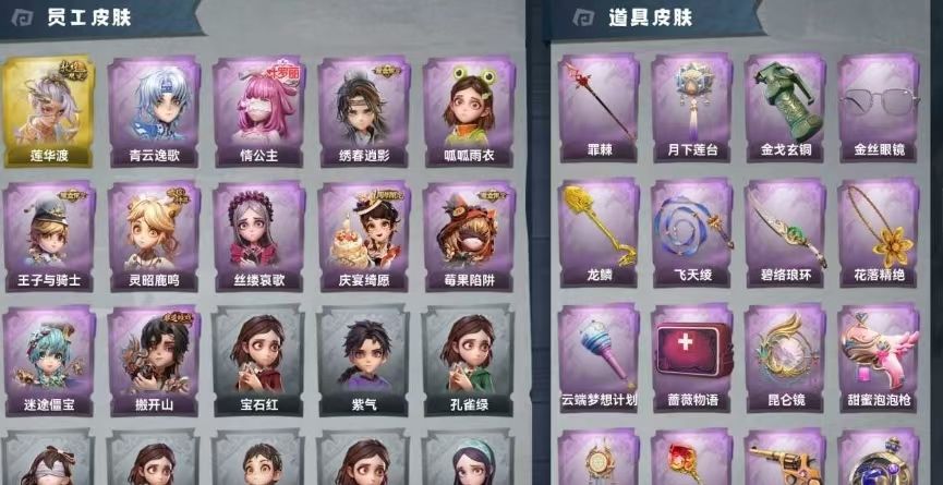 装备描述:皮肤:逍遥-莲华渡,零-青云逸歌,莉莉-情公主,逍遥-绣春逍影,小黄-呱呱雨衣,阿念-王子与骑士,阿念-灵昭鹿鸣,爱丽丝-丝缕哀歌,阿念-庆宴绮愿,莉莉-莓果陷阱,阿念-迷途僵宝,零-搬开山;道具:长枪-罪棘,腰包-月下莲台,闪光弹-金戈玄铜,夜视仪-金丝眼镜,铲子-龙鳞,长鞭-飞天绫,刺刀-碧络琅环,摸金符-花落精绝,专业手电-云端梦想计划,急救包-蔷薇物语,传送按钮-昆仑镜,电击枪-甜蜜泡泡枪,音响-鸣沙鼓,铲子-圣心之泪,转轮手枪-新星时代,传送按钮-逆时审判,喷气背包-乘风溯雪,黄牛能量饮料-珍珠芭乐莓莓,音响-happy猫,短管猎枪-星光的裁决;美妆:美妆-暗夜小恶魔;