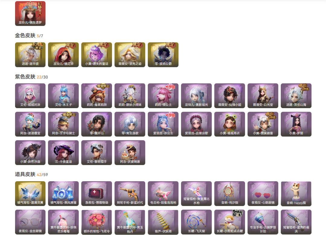 限制: 租号3次及以上 |装备描述:兔宝3月18号到期 皮肤:巫铃儿-镜生遗梦,薇薇安-圣光之谕,零-渡鸦公爵,巫铃儿-镜花辞,逍遥-莲华渡,小黄-遗失的童话,薇薇安-白光莹,小黄-呱呱雨衣,小黄-霓裳踏雪,阿念-王子与骑士,巫铃儿-素影瑶光,小黄-异色序曲,小黄-罗丽,零-青云逸歌,薇薇安-仙锋小姐,零-搬开山,艾伦-绒绒对决,阿念-庆宴绮愿,爱丽丝-冰公主,逍遥-泽引山海,莉莉-除妖小师妹,艾伦-黎明猎手,艾伦-水王子,莉莉-情公主,兰-千夜星谕,阿念-迷途僵宝,莉莉-莓果陷阱,爱丽丝-丝缕哀歌;道具:喷气背包-晶澜灵翼,长鞭-缚誓之锁,音响-冬夜暖忆,音响-鸣沙鼓,铲子-圣心之泪,长枪-罪棘,夜视仪-心跳眼镜,铲子-卡皮巴拉小黄豚铲,转轮手枪-新星时代,黄牛能量饮料-珍珠芭乐莓莓,电击枪-甜蜜泡泡枪,铲子-赞萌波板糖,桃木剑-最后的独角兽,折扇-露露扇,传送按钮-逆时审判,额外的背包-飞花令,腰包-宝剑八,长鞭-小狗蛇点点鞭,传送按钮-幻宠之门,腰包-惊魂娃娃,腰包-私藏的银河,葫芦-伏妖塔,桃木剑-凤鸣九天,黄牛能量饮料-雪顶奇愿,长鞭-飞天绫,专业手电-云端梦想计划,摸金符-祝祷词,摸金符-紫霄,刺刀-小鲨匕首