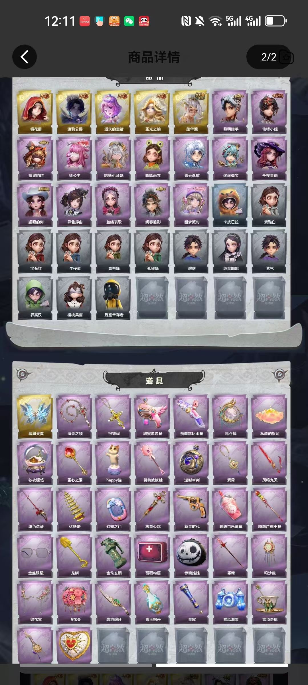 装备描述:皮肤:巫铃儿-镜花辞,零-渡鸦公爵,小黄-遗失的童话,薇薇安-圣光之谕,逍遥-莲华渡,艾伦-黎明猎手,薇薇安-仙锋小姐,莉莉-莓果陷阱,莉莉-情公主,莉莉-除妖小师妹,小黄-呱呱雨衣,零-青云逸歌,阿念-迷途僵宝,兰-千夜星谕,爱丽丝-耀眼的你,小黄-异色序曲,爱丽丝-丝缕哀歌,逍遥-绣春逍影,爱丽丝-甜梦派对;道具:喷气背包-晶澜灵翼,长鞭-缚誓之锁,摸金符-祝祷词,电击枪-甜蜜泡泡枪,短管猎枪-赞萌露比水枪,传送按钮-昆仑镜,腰包-私藏的银河,音响-冬夜暖忆,铲子-圣心之泪,音响-happy猫,铲子-赞萌波板糖,传送按钮-逆时审判,摸金符-紫霄,桃木剑-凤鸣九天,桃木剑-绯色遗证,葫芦-伏妖塔,传送按钮-幻宠之门,急救包-末章心跳,转轮手枪-新星时代,黄牛能量饮料-珍珠芭乐莓莓,长枪-糖葫芦霸王枪,夜视仪-金丝眼镜,铲子-龙鳞,闪光弹-金戈玄铜,急救包-蔷薇物语,腰包-惊魂娃娃,长枪-罪棘,音响-鸣沙鼓,夜视仪-敛花容,额外的背包-飞花令,刺刀-碧络琅环,黄牛能量饮料-青玉抱丹,专业手电-星寂,喷气背包-乘风溯雪,黄牛能量饮料-雪顶奇愿,除颤仪-弦外之音,腰包-宝剑八;美妆