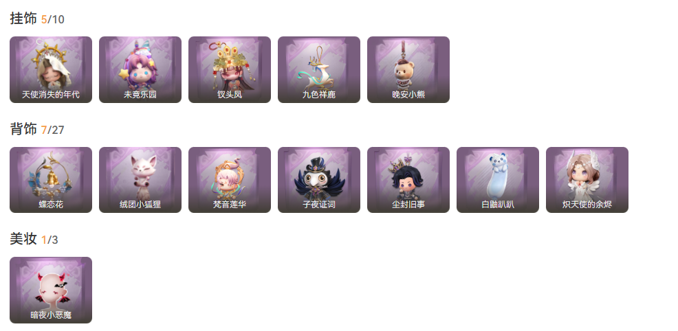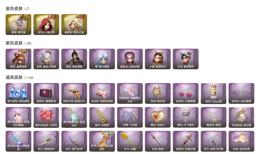 装备描述:金皮3;紫皮7;道具皮27;皮肤:薇薇安-圣光之谕,逍遥-莲华渡,巫铃儿-镜花辞,逍遥-绣春逍影,莉莉-除妖小师妹,爱丽丝-丝缕哀歌,莉莉-莓果陷阱,艾伦-黎明猎手,零-青云逸歌,小黄-呱呱雨衣;道具:腰包-月下莲台,黄牛能量饮料-珍珠芭乐莓莓,摸金符-紫霄,铲子-卡皮巴拉小黄豚铲,刺刀-碧络琅环,腰包-宝剑八,折扇-赴此良宵,黄牛能量饮料-青玉抱丹,夜视仪-心跳眼镜,喷气背包-乘风溯雪,短管猎枪-赞萌露比水枪,传送按钮-昆仑镜,急救包-末章心跳,夜视仪-金丝眼镜,转轮手枪-新星时代,长鞭-飞天绫,急救包-蔷薇物语,音响-happy猫,葫芦-伏妖塔,桃木剑-最后的独角兽,电击枪-甜蜜泡泡枪,刺刀-紫气东来,刺刀-铂刺与红萼,额外的背包-飞花令,音响-鸣沙鼓,长枪-罪棘,铲子-龙鳞;美妆:美妆-暗夜小恶魔;饰品:头饰-嘻嘻头套,头饰-萨卡班甲鱼头套,头饰-鱼头怪头套,头饰-烈焰红唇头套,头饰-小财神豚豚头套,头饰-烛光,头饰-惊魂南瓜头套,头饰-滑稽头套,头饰-卑微头套,头饰-大葱明头套,头饰-精致露比头套,头饰-哈士奇头套,头饰-樱桃奶油布丁,头饰