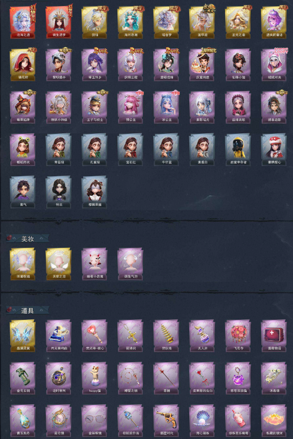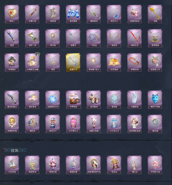 装备描述:薇薇安-沧海之遗、巫铃儿-镜生遗梦 【金色皮肤】逍遥-剑仙、薇薇安-海月息潮、莉莉-瑶台梦、逍遥-莲华渡、薇薇安-圣光之谕、小黄-遗失的童话、巫铃儿-镜花辞 【紫色皮肤】艾伦-黎明猎手、巫铃儿-琢玉怀乡、临云-织锦云程、零-磨砺成锋、阿念-庆宴绮愿、薇薇安-仙锋小姐、艾伦-绒绒对决、莉莉-莓果陷阱、莉莉-除妖小师妹、阿念-王子与骑士、莉莉-情公主、爱丽丝-冰公主、巫铃儿-素影瑶光、爱丽丝-丝缕哀歌、逍遥-绣春逍影、小黄-呱呱雨衣 【道具皮肤】喷气背包-晶澜灵翼、音响-月光奏鸣曲、摸金符-祝祷词、葫芦-伏妖塔、黄牛能量饮料-无人岸、额外的背包-飞花令、急救包-蔷薇物语、闪光弹-金戈玄铜、传送按钮-逆时审判、音响-happy猫、长鞭-缚誓之锁、专业手电-花束般的告白、闪光弹-邪恶滚滚猫、伞-沐春颂、黄牛能量饮料-青玉抱丹、传送按钮-昆仑镜、夜视仪-金丝眼镜、电击枪-权杖的许诺、转轮手枪-新星时代、葫芦-海心凝珠、黄牛能量饮料-珍珠芭乐莓莓、腰包-私藏的银河、腰包-宝剑八、急救包-末章心跳、音响-咏叹调、喷气背包-乘风溯雪、刺刀-碧络琅环、摸金符-海洋之心、电击枪-甜蜜泡泡枪、具体看图