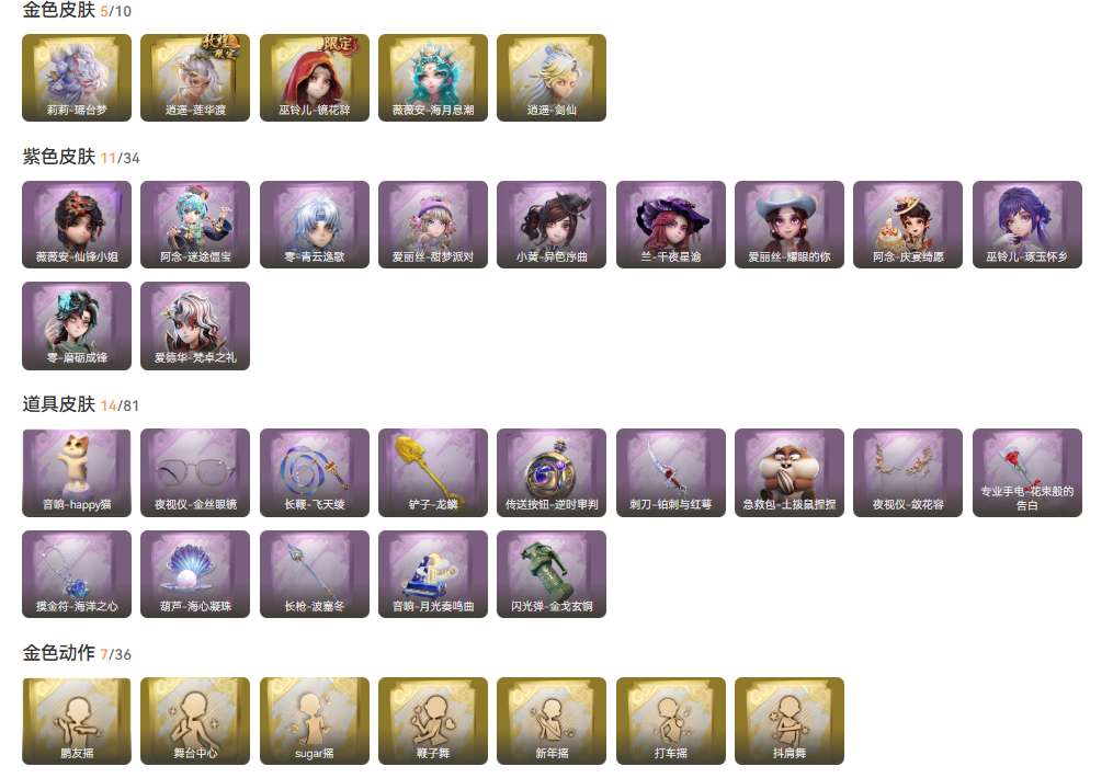 装备描述:金皮5;紫皮11;道具皮15;皮肤:逍遥-剑仙,薇薇安-海月息潮,逍遥-莲华渡,莉莉-瑶台梦,巫铃儿-镜花辞,阿念-迷途僵宝,零-磨砺成锋,小黄-异色序曲,爱丽丝-耀眼的你,爱德华-梵卓之礼,薇薇安-仙锋小姐,零-青云逸歌,兰-千夜星谕,爱丽丝-甜梦派对,巫铃儿-琢玉怀乡,阿念-庆宴绮愿;道具:传送按钮-逆时审判,刺刀-铂刺与红萼,铲子-龙鳞,音响-happy猫,专业手电-花束般的告白,闪光弹-金戈玄铜,夜视仪-,音响-月光奏鸣曲,摸金符-海洋之心,长枪-波塞冬,长鞭-飞天绫,葫芦-海心凝珠,夜视仪-金丝眼镜,急救包-土拨鼠捏捏,伞-伞;美妆:美妆-暗夜小恶魔;饰品:头饰-纪念,头饰-嘻嘻头套,头饰-哈士奇头套,头饰-萨卡班甲鱼头套,头饰-呆滞头套,头饰-面具马头套,头饰-芝麻糊汤圆,头饰-蒜了八,头饰-滑稽头套,头饰-烈焰红唇头套,头饰-饺饺者头套,头饰-卑微头套,头饰-鱼头怪头套,头饰-马上有钱,头饰-像素朋克墨镜,头饰-后室幸存者头套,挂饰-糖果守卫,挂饰-钗头凤,挂饰-晚安小熊,挂饰-桂冠聆诗,挂饰-尘封旧事,挂饰-孤独对望,背饰-子夜证词,背饰-牛啤背包;动作:动作-舞台中心