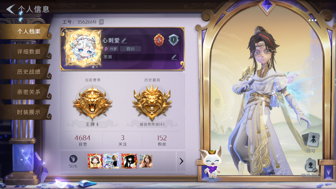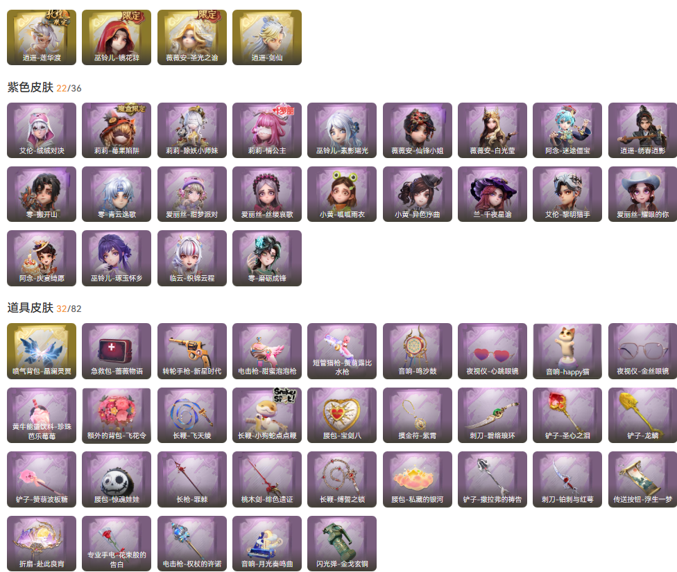 装备描述:大翅膀 金皮4;紫皮22;道具皮32;皮肤:逍遥-莲华渡,薇薇安-圣光之谕,巫铃儿-镜花辞,逍遥-剑仙,零-磨砺成锋,阿念-迷途僵宝,兰-千夜星谕,小黄-异色序曲,零-搬开山,莉莉-情公主,薇薇安-白光莹,零-青云逸歌,艾伦-黎明猎手,巫铃儿-素影瑶光,爱丽丝-甜梦派对,逍遥-绣春逍影,小黄-呱呱雨衣,薇薇安-仙锋小姐,临云-织锦云程,艾伦-绒绒对决,巫铃儿-琢玉怀乡,爱丽丝-耀眼的你,阿念-庆宴绮愿,莉莉-除妖小师妹,爱丽丝-丝缕哀歌,莉莉-莓果陷阱;道具:喷气背包-晶澜灵翼,桃木剑-绯色遗证,摸金符-紫霄,音响-happy猫,长鞭-飞天绫,黄牛能量饮料-珍珠芭乐莓莓,传送按钮-浮生一梦,铲子-赞萌波板糖,专业手电-花束般的告白,长枪-罪棘,铲子-圣心之泪,长鞭-缚誓之锁,折扇-赴此良宵,腰包-私藏的银河,短管猎枪-赞萌露比水枪,电击枪-权杖的许诺,长鞭-小狗蛇点点鞭,铲子-龙鳞,夜视仪-心跳眼镜,夜视仪-金丝眼镜,刺刀-碧络琅环,音响-月光奏鸣曲,电击枪-甜蜜泡泡枪,腰包-惊魂娃娃,闪光弹-金戈玄铜,音响-鸣沙鼓,刺刀-铂刺与红萼,腰包-宝剑八,额外的背包-飞花令,转轮手枪-新星时
