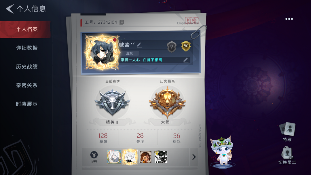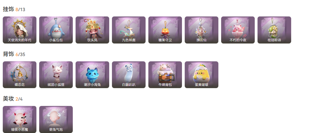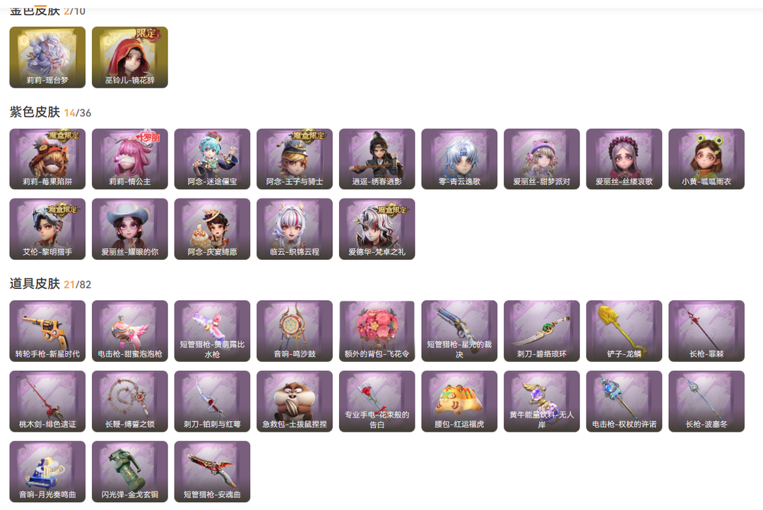 装备描述:皮2;紫皮14;道具皮22;皮肤:莉莉-瑶台梦,巫铃儿-镜花辞,爱丽丝-甜梦派对,爱德华-梵卓之礼,阿念-庆宴绮愿,阿念-王子与骑士,莉莉-莓果陷阱,逍遥-绣春逍影,临云-织锦云程,零-青云逸歌,爱丽丝-丝缕哀歌,阿念-迷途僵宝,艾伦-黎明猎手,莉莉-情公主,小黄-呱呱雨衣,爱丽丝-耀眼的你;道具:刺刀-碧络琅环,短管猎枪-赞萌露比水枪,腰包-红运福虎,桃木剑-绯色遗证,黄牛能量饮料-无人岸,专业手电-花束般的告白,电击枪-甜蜜泡泡枪,铲子-龙鳞,闪光弹-金戈玄铜,长枪-罪棘,刺刀-铂刺与红萼,短管猎枪-星光的裁决,长鞭-缚誓之锁,短管猎枪-安魂曲,音响-月光奏鸣曲,转轮手枪-新星时代,音响-鸣沙鼓,额外的背包-飞花令,电击枪-权杖的许诺,急救包-土拨鼠捏捏,长枪-波塞冬,伞-伞;美妆:美妆-暗夜小恶魔,美妆-萌兔气泡;饰品:头饰-太空鲨头套,头饰-面具马头套,头饰-芝麻糊汤圆,头饰-蒜了八,头饰-雪墩墩头套,头饰-萨卡班甲鱼头套,头饰-炙热烧烤,头饰-呆滞头套,头饰-烈焰红唇头套,头饰-卑微头套,头饰-烛光,头饰-煤球喵头套,头饰-滑稽头套,头饰-哈士奇头套,头饰-樱桃奶油布丁,