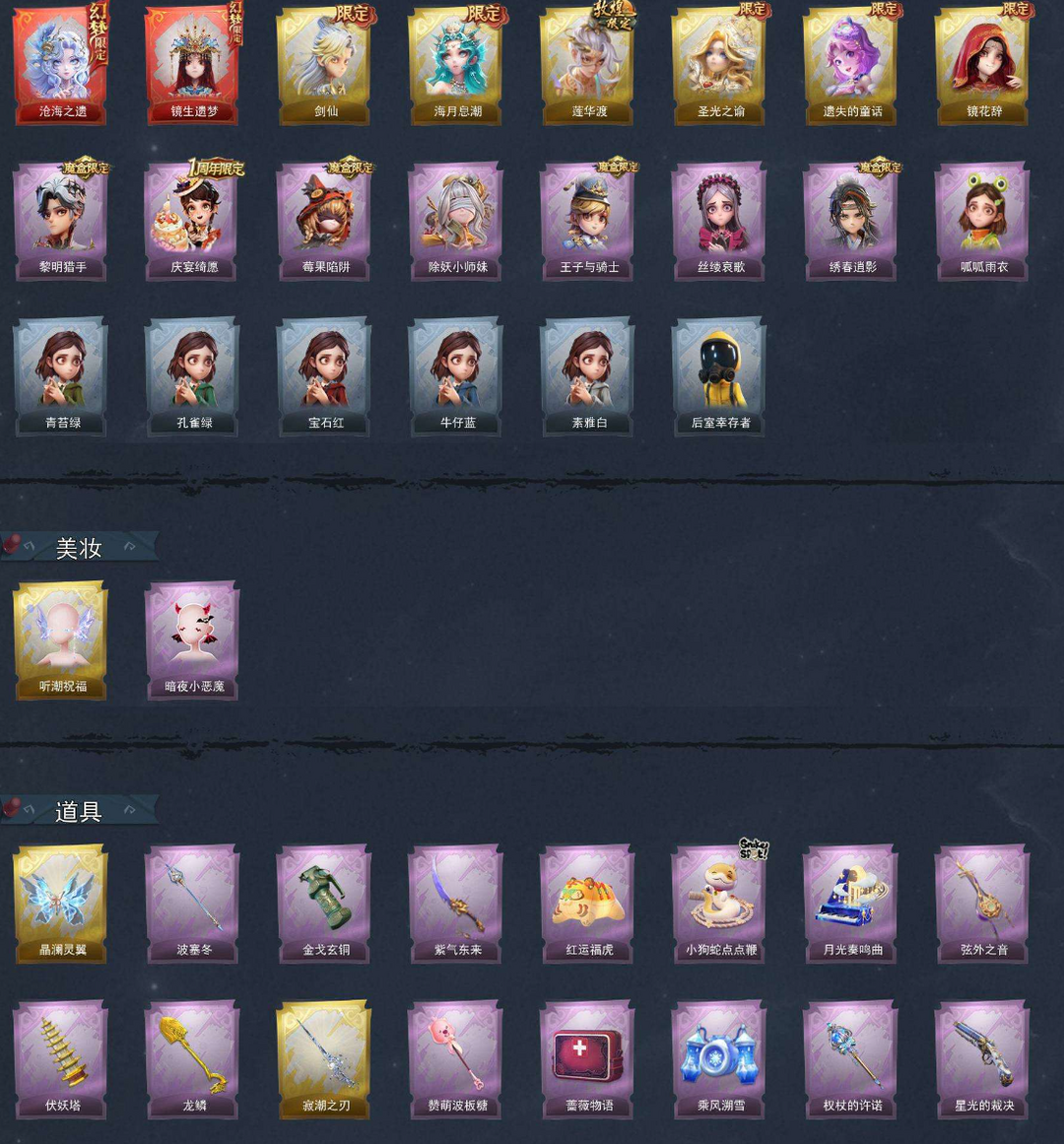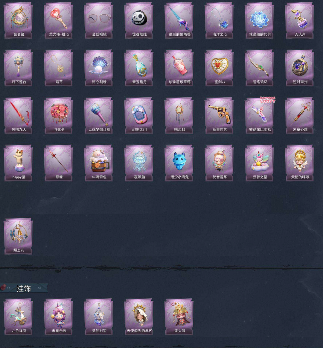 限制: 撤单率<29%才可租用此帐号装备描述:【员工】逍遥、薇薇安、巫铃儿、莉莉、艾伦、爱德华、兰、小满、临云、小黄、爱丽丝、零、阿念 【幻梦皮肤】薇薇安-沧海之遗、巫铃儿-镜生遗梦 【金色皮肤】逍遥-剑仙、薇薇安-海月息潮、逍遥-莲华渡、薇薇安-圣光之谕、小黄-遗失的童话、巫铃儿-镜花辞 【紫色皮肤】艾伦-黎明猎手、阿念-庆宴绮愿、莉莉-莓果陷阱、莉莉-除妖小师妹、阿念-王子与骑士、爱丽丝-丝缕哀歌、逍遥-绣春逍影、小黄-呱呱雨衣 【道具皮肤】喷气背包-晶澜灵翼、长枪-波塞冬、闪光弹-金戈玄铜、刺刀-紫气东来、腰包-红运福虎、长鞭-小狗蛇点点鞭、音响-月光奏鸣曲、除颤仪-弦外之音、葫芦-伏妖塔、铲子-龙鳞、桃木剑-寂潮之刃、铲子-赞萌波板糖、急救包-蔷薇物语、喷气背包-乘风溯雪、电击枪-权杖的许诺、短管猎枪-星光的裁决、传送按钮-昆仑镜、夜视仪-金丝眼镜、腰包-惊魂娃娃、桃木剑-最后的独角兽、摸金符-海洋之心、除额仪-冰晶般的代价、黄牛能量饮料-无人岸、腰包-月下莲台、摸金符-紫霄、葫芦-海心凝珠、黄牛能量饮料-青玉抱丹、黄牛能量饮料-珍珠芭乐莓莓、腰包-宝剑八、刺刀-碧络琅环、传送按钮-逆时审判、桃木剑-凤鸣九天、