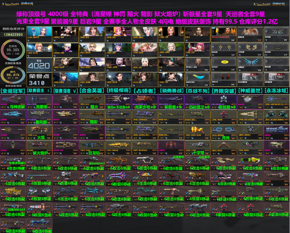 限制: 租号5次及以上 | 撤单率<30%才可租用此帐号装备描述:网通一区超超极品,24季全满。高等级浅绿称全装号,4100级,荣誉3400点,全能冠军。很多绝版荣誉,绝版皮肤,绝版三太子,绝版称号。全神全霸全传奇。金鲨、聚能器+9、巨岩+9,斩极星全套+9。天巡者全套+9。光束步枪全套+9。维京步枪全套、闪电MK3A1、闪电野牛、闪电AN-94、全部保底(雷索流星锤、神罚暴风眼、火狐、狱火熔炉、黯火、恶龙、黯影、狂龙钻、月光等)。全塞季、全人物、全部皮肤枪。武器持有99.4%,人物持有98%,仓库评分4500万,绝版武器,极品强化。5000万积分打造极品双66配件。 A佬出租欢迎你的光临!喜欢请收藏店铺,店铺里下单可领红包