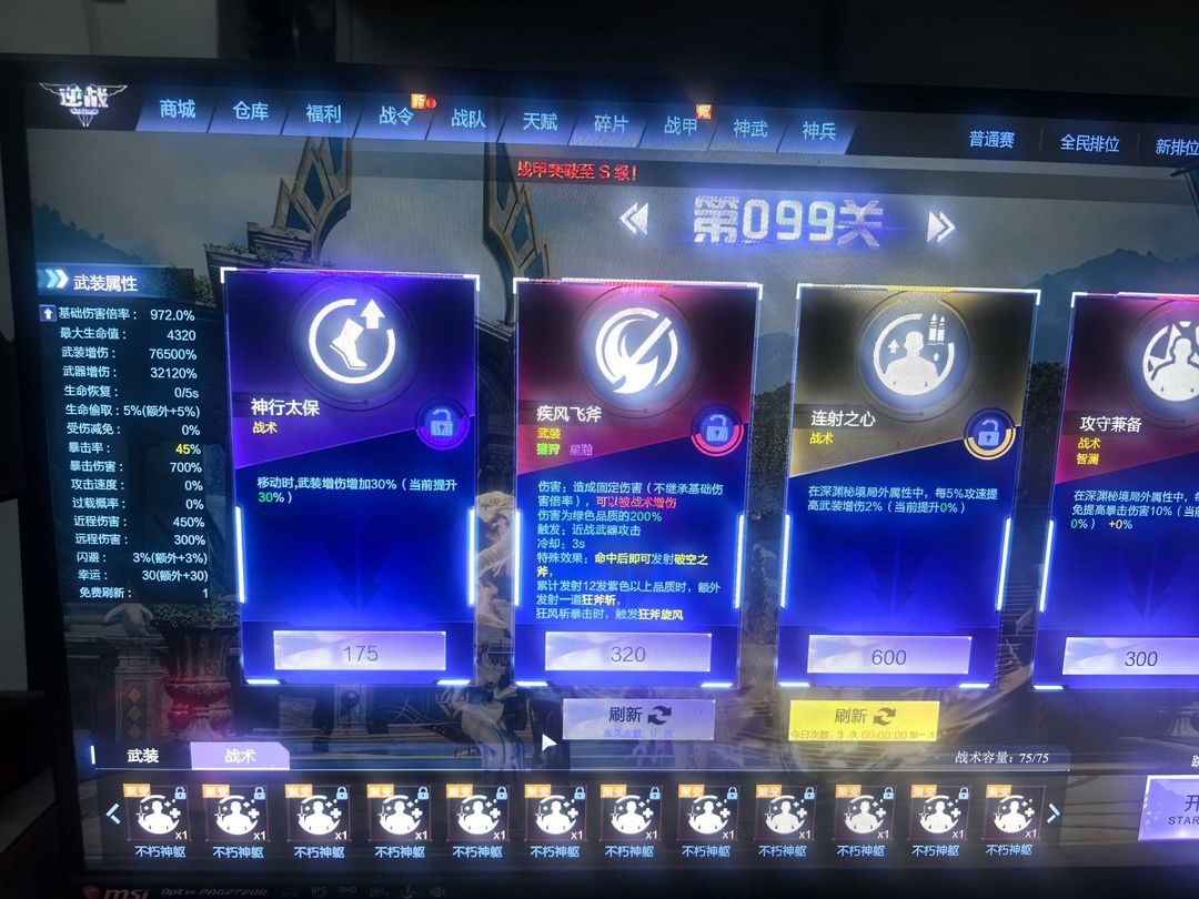 秘境99关已过(战术满沉淀5转武装),基础伤害倍率972,(光、风、冰)神武全45星,能量再生60