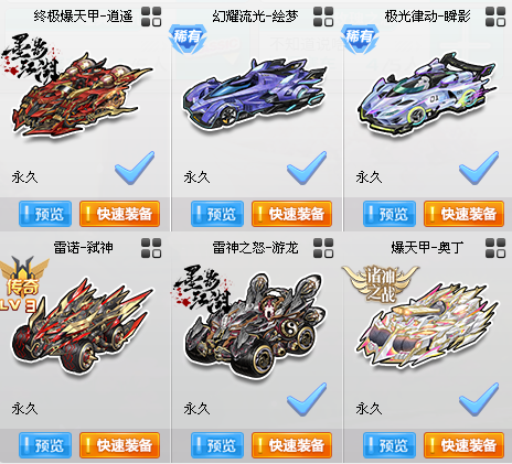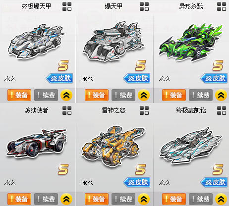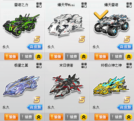 装备描述:【14辆S】爆天雷诺❤爆天甲-奥丁❤终爆-逍遥❤智慧之神-大耳狗❤众神-麒麟❤终麦-赵云❤雷神之怒-游龙❤末日使者❤炼狱使者❤代达罗斯❤异性杀戮❤极星之翼❤终极众神❤爆天甲Mini❤【3辆T2 7辆T1】雷霆机甲❤雷霆霸主❤御皇铠甲❤【90辆A】幻夜7阶❤魔王雷诺❤电玩雷诺