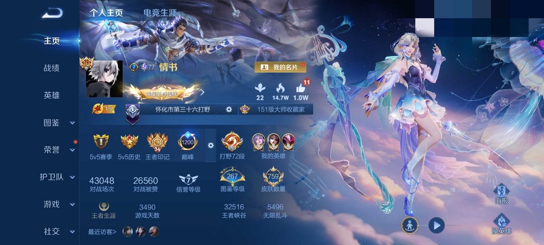 荣耀v10不禁言❤759皮历史百强打野72段历史5国服貂蝉老虎1.9露娜❤王昭君-长夜焕生❤️满小兵
