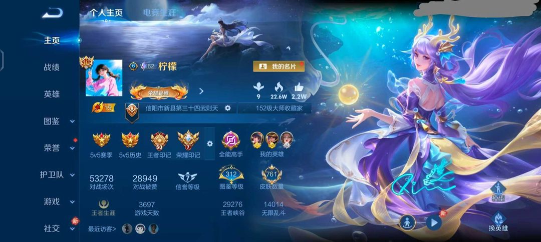 荣耀V10不禁言❤️761皮满皮肤满水晶满无双满星元满按键8小兵❤图鉴312级❤孙悟空无双 无相