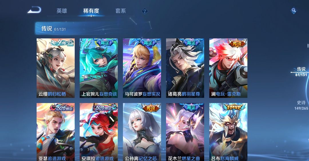 本游戏账号: V10用户,基础段位:至尊星耀II,英雄多,皮肤多。典藏皮肤4个,感受典藏皮肤带来的优质体验快感,FMVP皮肤8个,尽情享受FMVP皮肤带来的主角光环, 私人所属英雄皮肤有:关羽 赤影疾锋||花木兰 九霄神辉||瑶 拾光映像||武则天 倪克斯神谕典韦 战鼓燎原||孙悟空 零号·赤焰||孙悟空 地狱火||吕布 天魔缭乱||孙尚香 末日机甲||孙策 挚爱之约||孙策 末日机甲||李白 诗剑行||李白 凤求凰||司空震 愿照·山河定||公孙离 记忆之芯||虞姬 愿照·岁时盈||虞姬 启明星使||杨戬 永曜之星||澜 愿照·九州拓||后羿 黄金射手座||墨子 黄金天蝎座||诸葛亮 武陵仙君||李信 山海·炽霜斩||李信 一念神魔||妲己 愿照·众生和||百里守约 碎云||曜 山海·苍雷引||曜 李逍遥||小乔 音你心动||铠 绛天战甲||上官婉儿 神器·万象笔||武则天 海洋之心||宫本武藏 地狱之眼||张良 黄金白羊座||女娲 愿照·千秋盛||狄仁杰 超时空战士||貂蝉