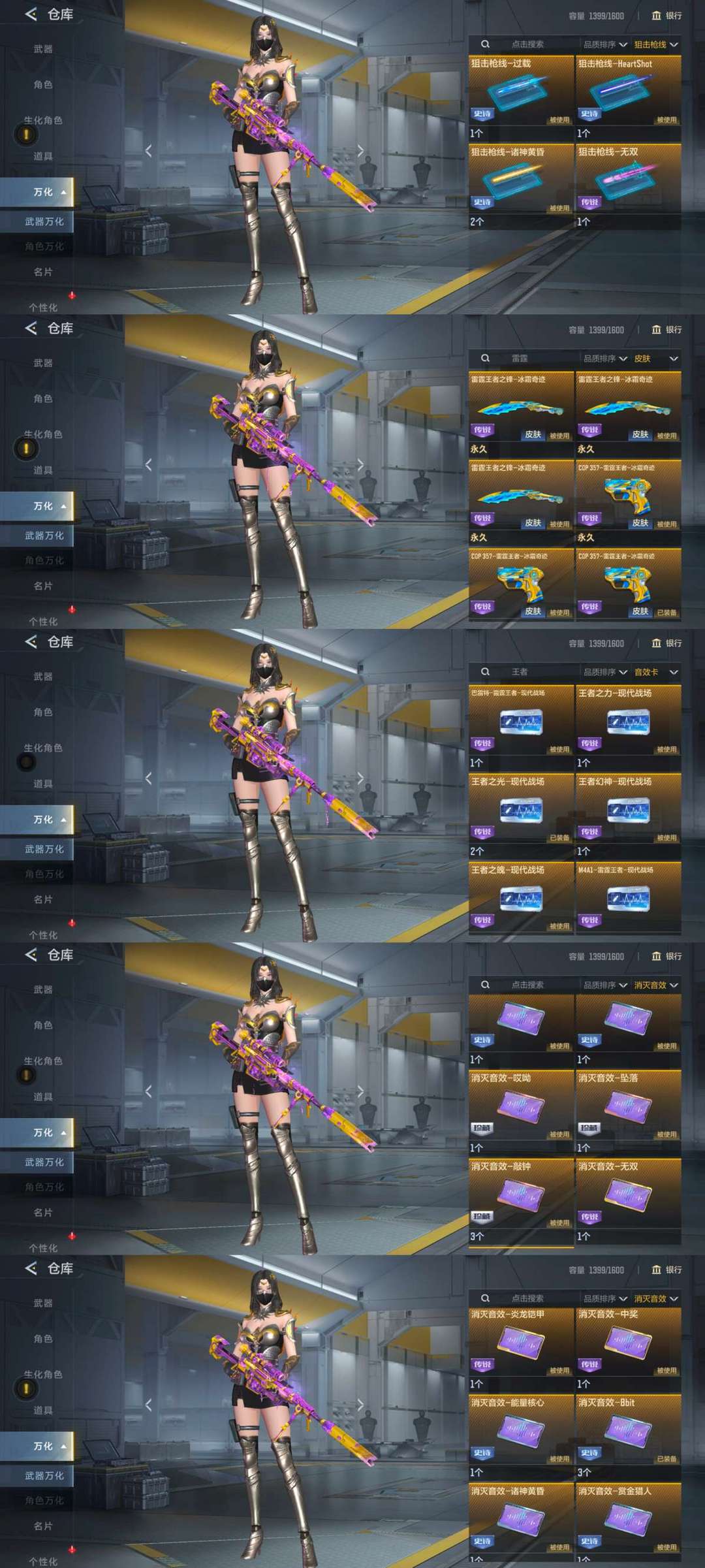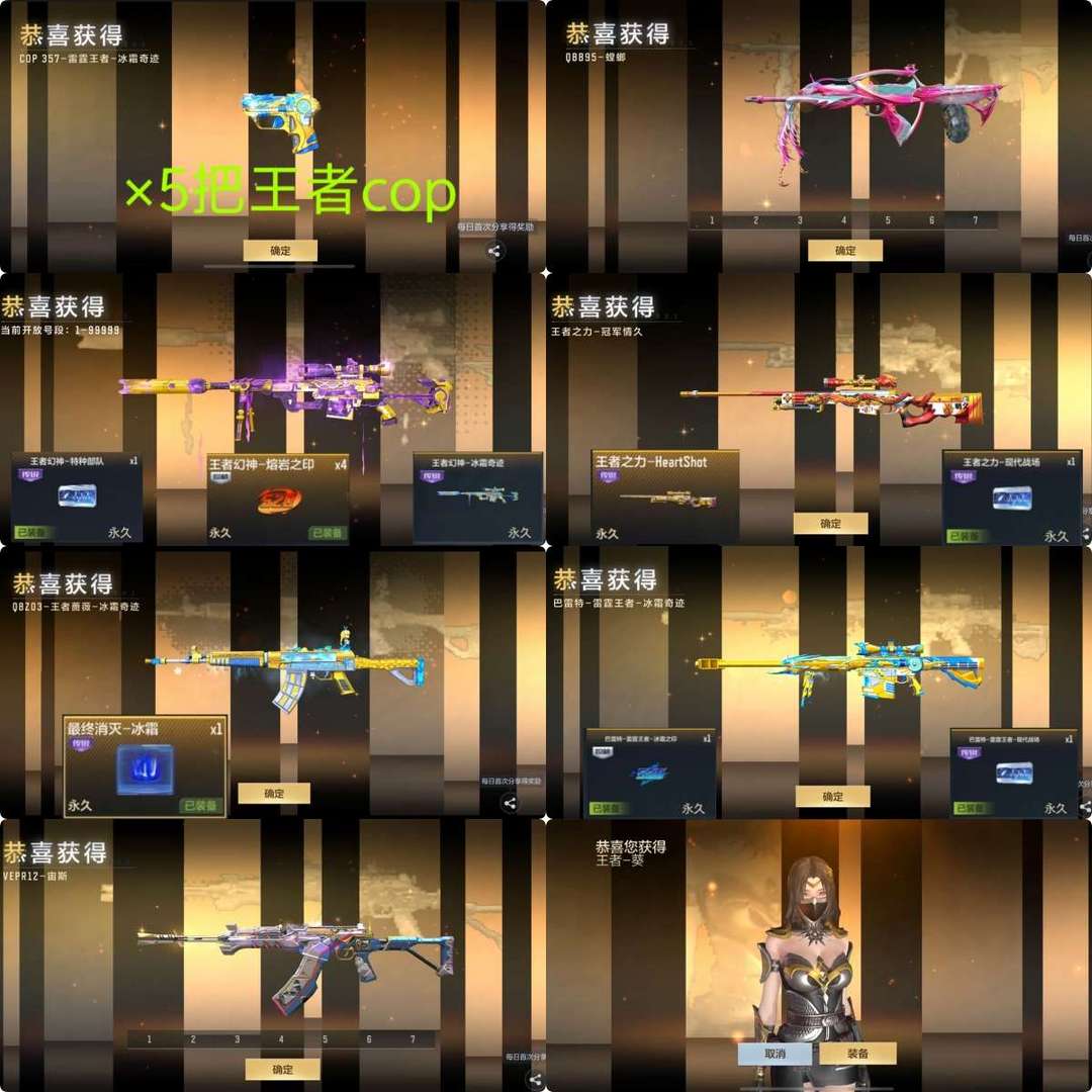主流王者武器有【王力】【王翎】【王者蔷薇】【雷霆m4】【雷霆ak】【雷霆狙】【王腾】【王魄】【王心】【王影】【王怒】【王擎】【王光】【王幻】【王蝶】【王狱】【王者cop✘4】【王峰✘4】【雷霆王峰✘3】