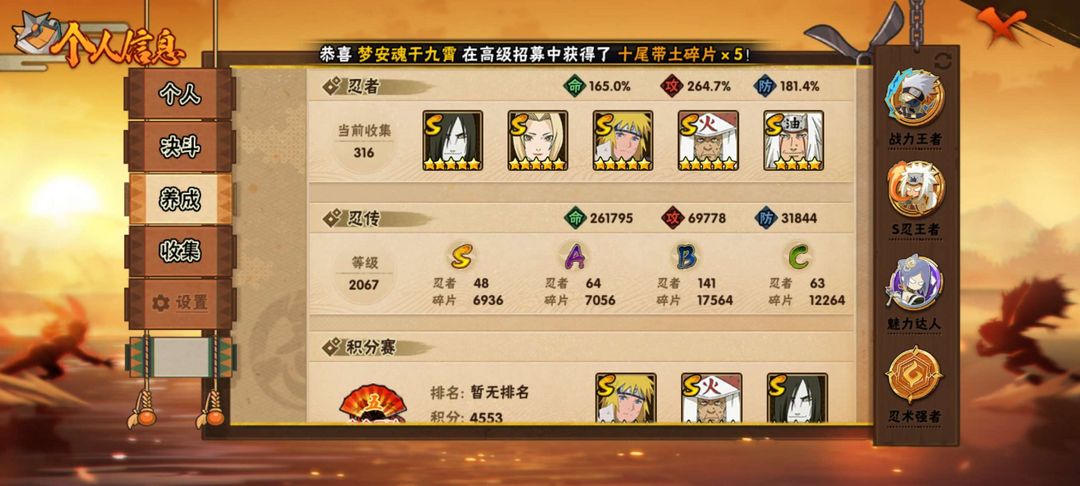 装备描述:晓创生迪达拉最强十尾带土神威对决卡卡西宇智波斑五影会谈最强仙人巳月金身水门秽土再不斩传说自来也百战须佐鼬舍人宇智波泉奈秽土角度绯琉琥蝎须佐卡卡西大木同舍人机械鸣人已秒✨46S✨64A✨忍战带土✨天道超✨九赖嘛连结✨万花筒佐助✨死二代✨死初代✨2800w战✨走过路过不要错过。禁止利用账号进行开挂、使用辅助违规软件诈骗等违规操作。喜欢本账号请点 ☆收藏☆ 方便下次租用,谢谢光临惠顾!毁号行为涉及毁坏虚拟财产罪及计算机安全罪,请文明游戏素质游戏,让我们共建美好租号平台!请游戏局内保持文明,防止禁言影响他人游戏,祝您玩得愉快!