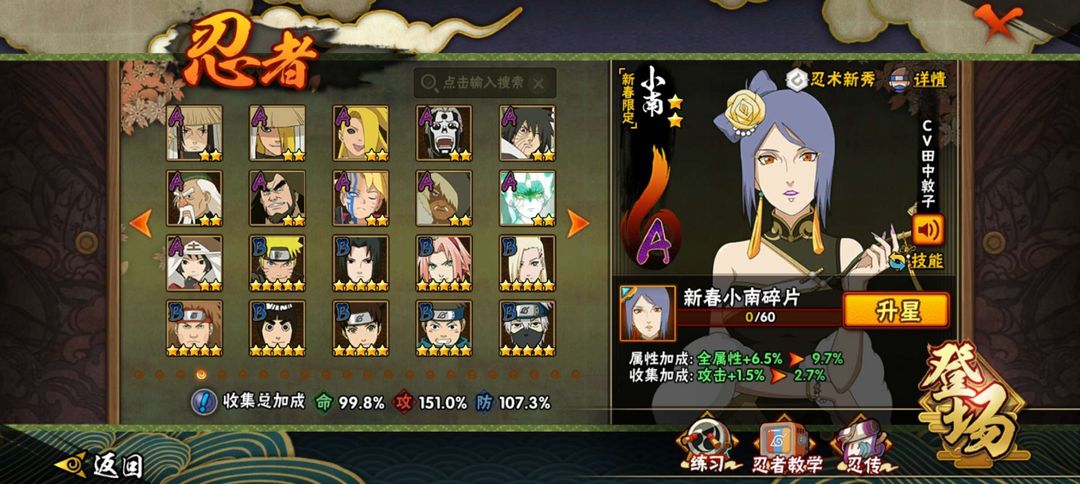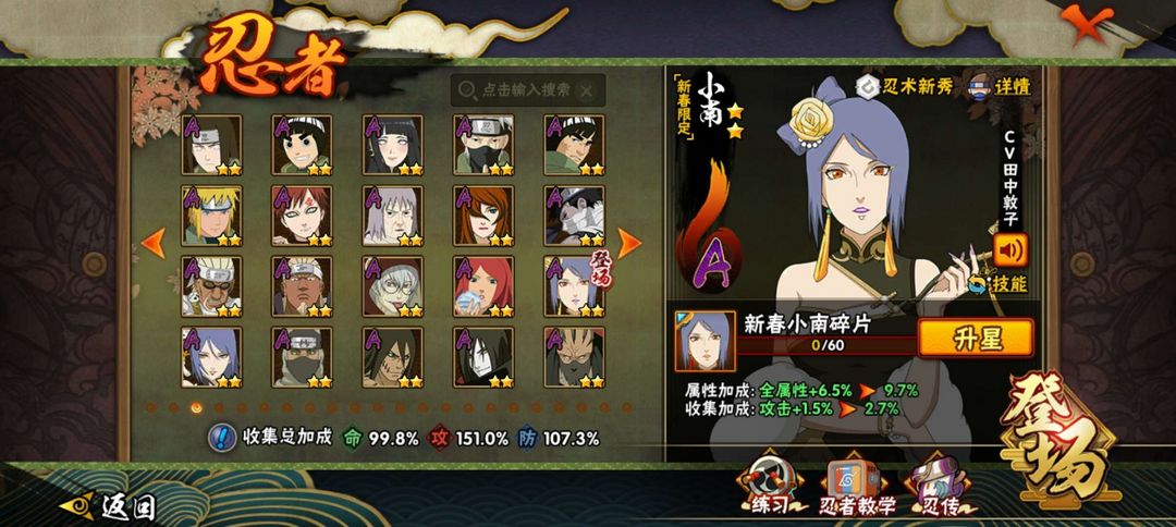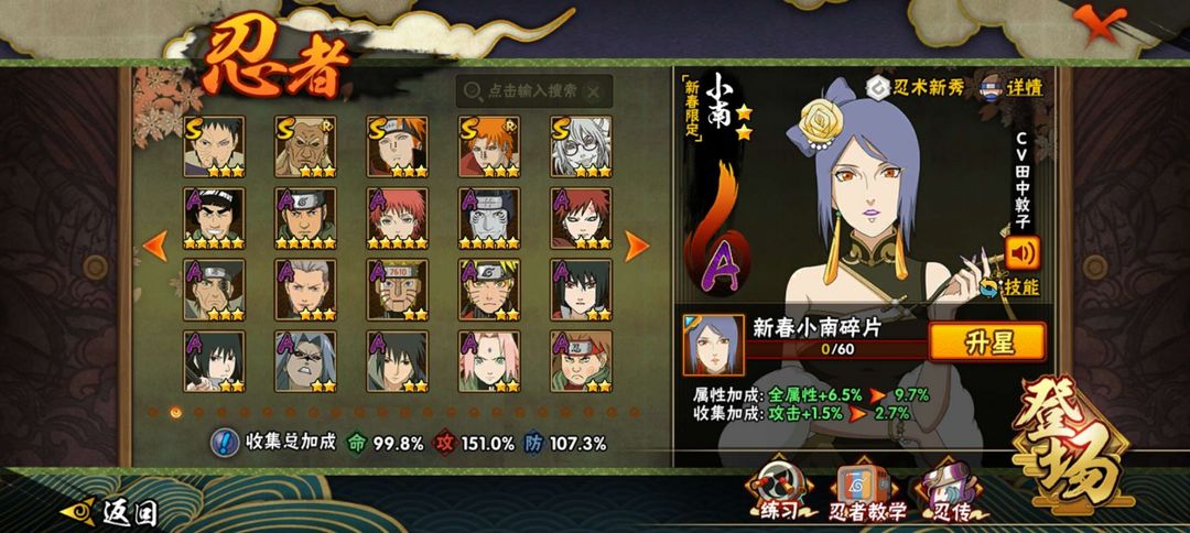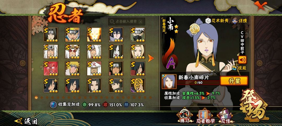25S,46A。熊猫蛞蝓。创立斑,天道超,须佐止水等S;暴怒带土,鸡翅佐助,新春小南等A