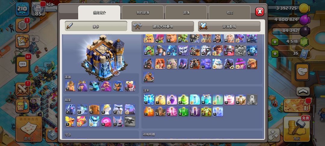 18本顶配号,药水充足,多个满级兵种,绝版背景皮肤,稀有英雄皮肤