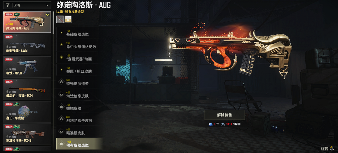 ④级弥勒斯AUG✅灵魂枷锁AKM✅唐三藏SLR✅金色落叶AKM✅无慈悲98K✅幽冥之握M24✅水手S