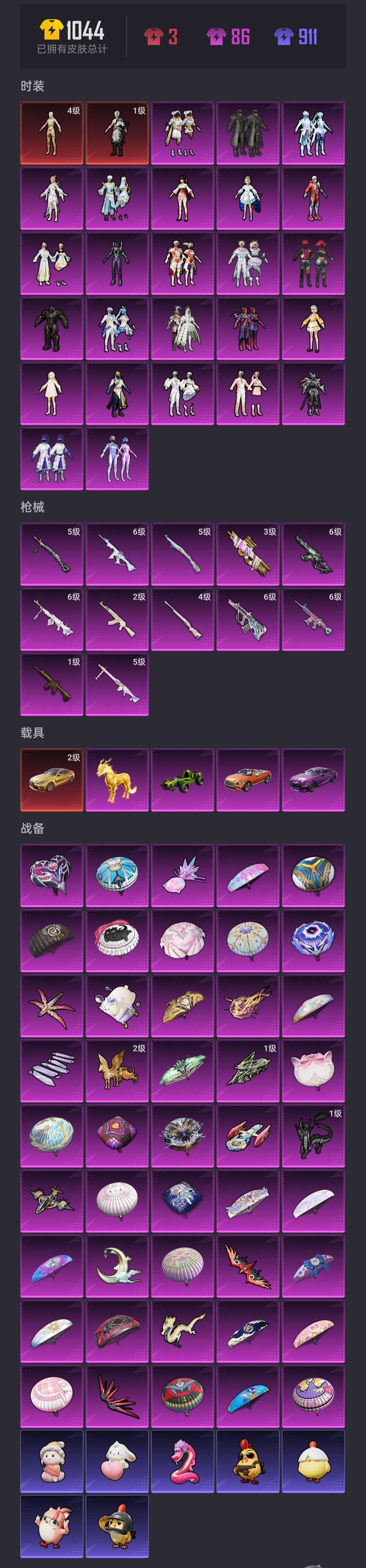 该号女号,禁止打广,禁止开挂,禁止骂人,禁止分解枪械,禁止坐挂车,文明游戏,谢谢宝宝们~祝宝宝游戏愉快~ 套装178个,粉套25个 枪皮255个,特效枪12个 载具皮肤5个 装备364个,三级头48个,三级包57个 降落伞100个,滑翔尾迹23个,伙伴7个,动作109个 祝您游戏愉快请不要有开挂坐挂车等违规行为喔~文明游戏谢谢宝宝~