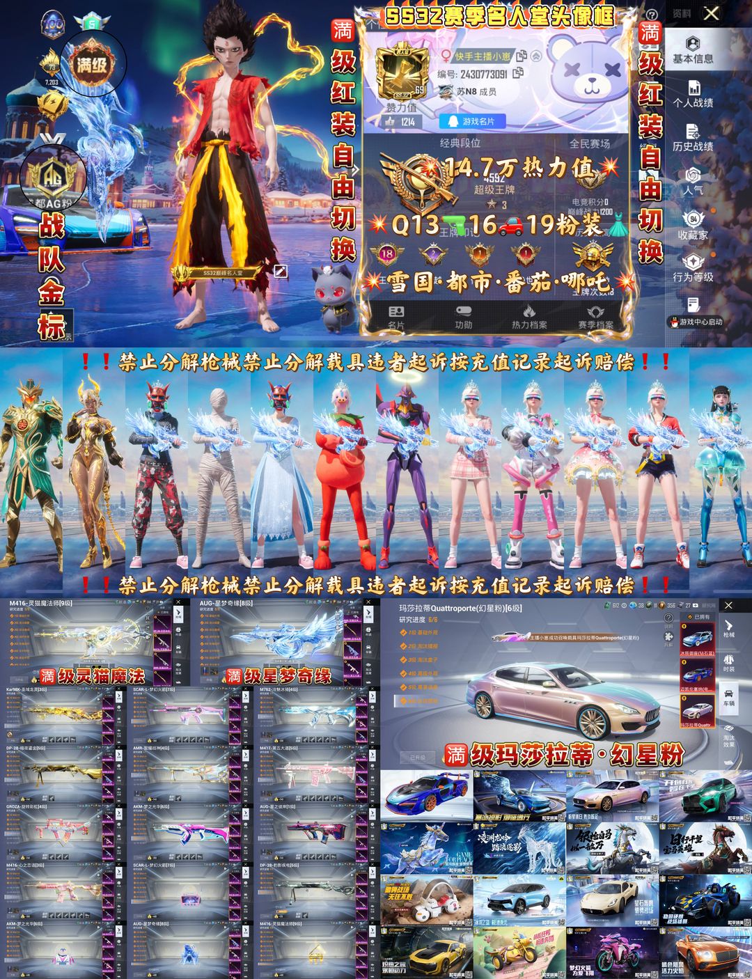 本游戏账号:特效枪数量7个,粉装数量18套,载具数量12个,优质装备有: AKM-梦之光华, SCAR-L-梦幻火箭, M416-心之恋语, AUG-星之彼岸, 套装-雪国幻梦, 套装-梦幻火箭, 套装-缤纷油彩, 套装-放客神游, 套装-星之彼岸, 星之彼岸降落伞, 伏魔团降落伞, 梦幻火箭降落伞, 香水柠檬降落伞, 玛莎拉蒂Quattroporte(幻星粉), 合金龙骨(蓝), 双人摩托-梦幻火箭, 玛莎拉蒂MC20(星石白), 星之彼岸头盔(3级), 香水柠檬头盔(3级), 梦幻火箭头盔(3级)等,供您畅选,感受良好游戏体验!