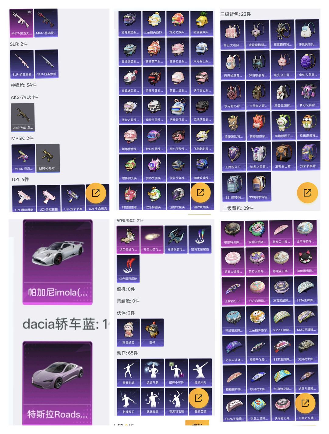该号女号噢 套装138件,粉色2件 枪皮194个,特效枪6个 载具皮肤2个 装备209个,三级头29个,三级包22个 降落伞57个,滑翔尾迹5个,动作65个 祝您游戏愉快~请勿开挂~谢谢各位宝宝配合~
