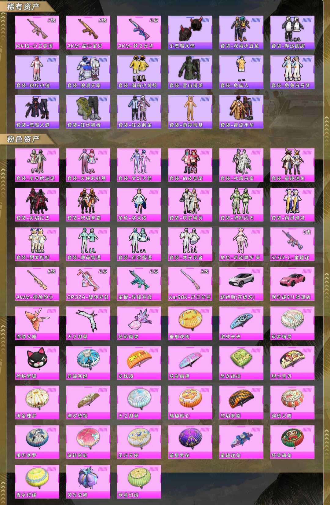 17粉套8升级枪2载具⚡洛天依⚡梦幻火箭⚡深海小丑鱼⚡巧克力ak⚡保时捷911