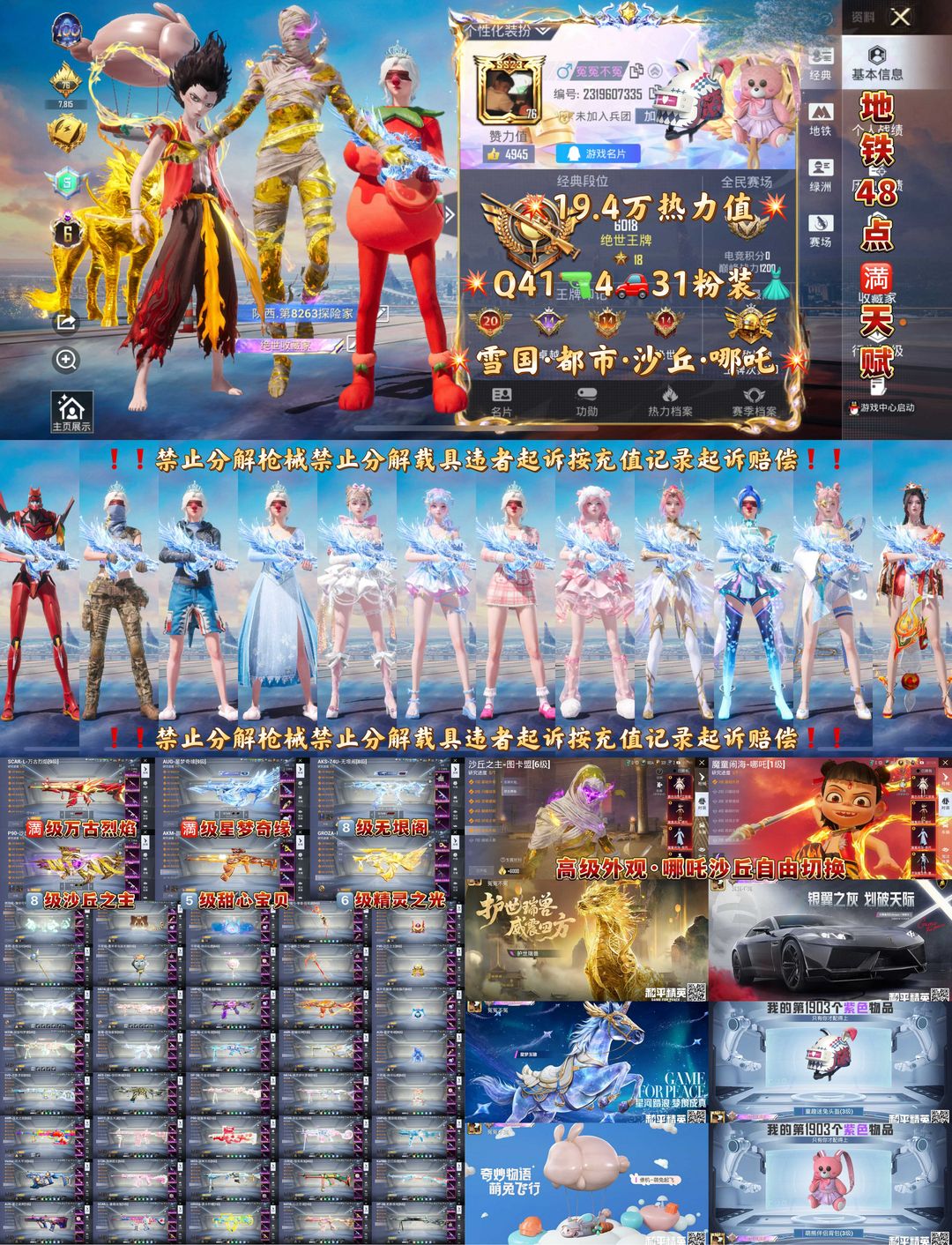 毁号,涉及毁坏虚拟财产罪及计算机安全罪,请文明游戏素质游戏,让我们共建美好租号平台 【特别事项】 红装可任意分解升级所需要满级的红装 禁止分解枪械载具,违者拉黑起诉赔偿 非账号问题撤单的全部永久拉黑 A.游戏过程中请不要恶意挂机或者不文明发言 B.恶意挂机、顶号等行为将被拉黑无法再次下单 C.进入游戏后中途请勿退出登陆,否则无法再次上号 D.部分账号由于异地登录可能会出现密码错误提示,通常再尝试5-6次后可上号 喜欢本账号请点 ☆收藏☆ 方便下次租用,谢谢光临惠顾