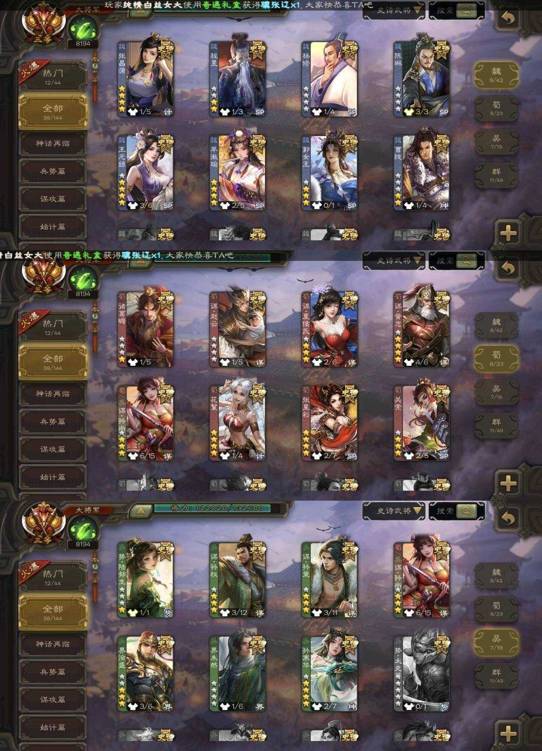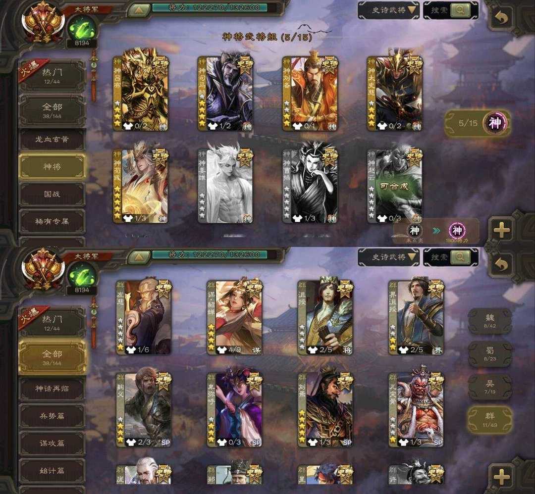 装备描述:三等大将军 VIP:12 武将总数:363 史诗武将:38 动态皮肤:40 魏国武将:?张昌蒲?程昱?杨修?陈琳?王元姬?羊徽瑜?郭女王?曹纯? 蜀国武将:?诸葛瞻?谋赵云?谋夏侯氏?谋黄忠?谋孙尚香?花鬘?张星彩?关索? 吴国武将:?势陆郁生?谋孙权?谋孙策?界徐盛?界朱然?孙寒华? 群雄武将:?左慈?谋貂蝉?沮授?界沮授?麹义?卑弥呼?刘焉?兀突骨?南华老仙?郑玄?星甘宁? 神将:?神吕蒙?神周瑜?神诸葛亮?神吕布?神司马懿?神刘备?神太史慈?神荀彧? 排位武将:121 国战武将:90 鉴往知来-神司马懿 匡汉延祚-神荀彧 婆娑起舞-王元姬 鼠年冬至-王元姬 月耀华裳-羊徽瑜 明良千古-孙尚香 临军对阵-张星彩 扬刀立威-麹义 雄踞益州-刘焉